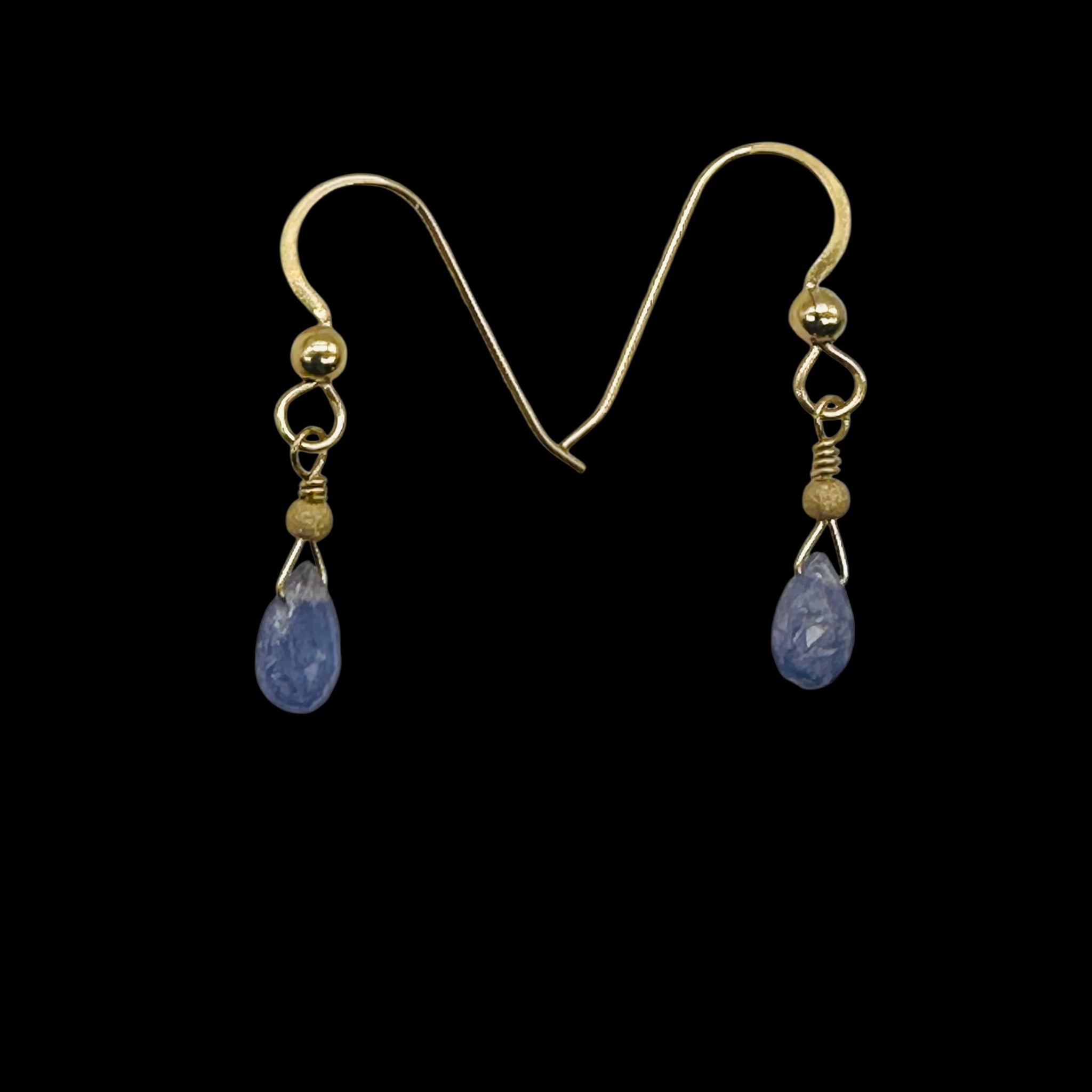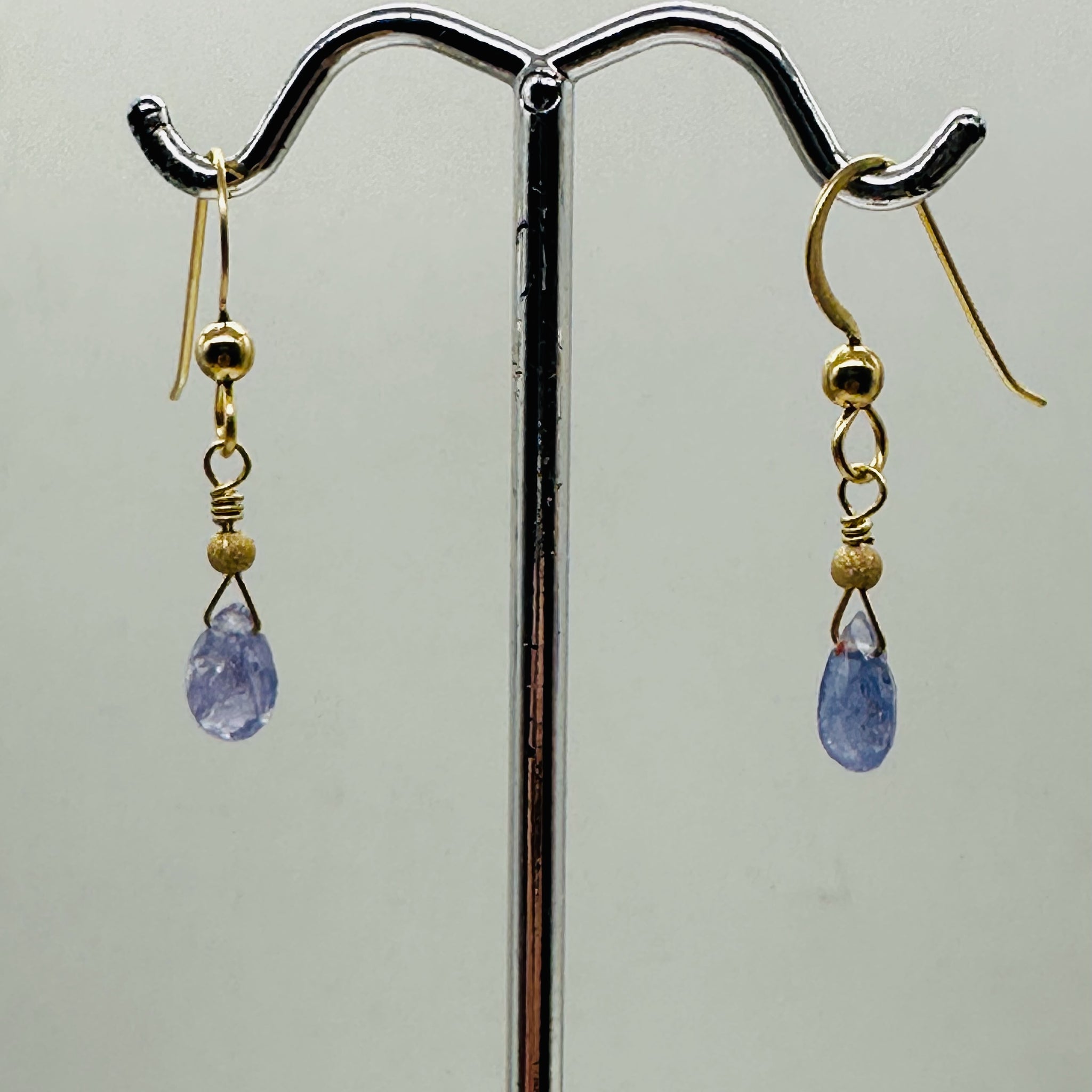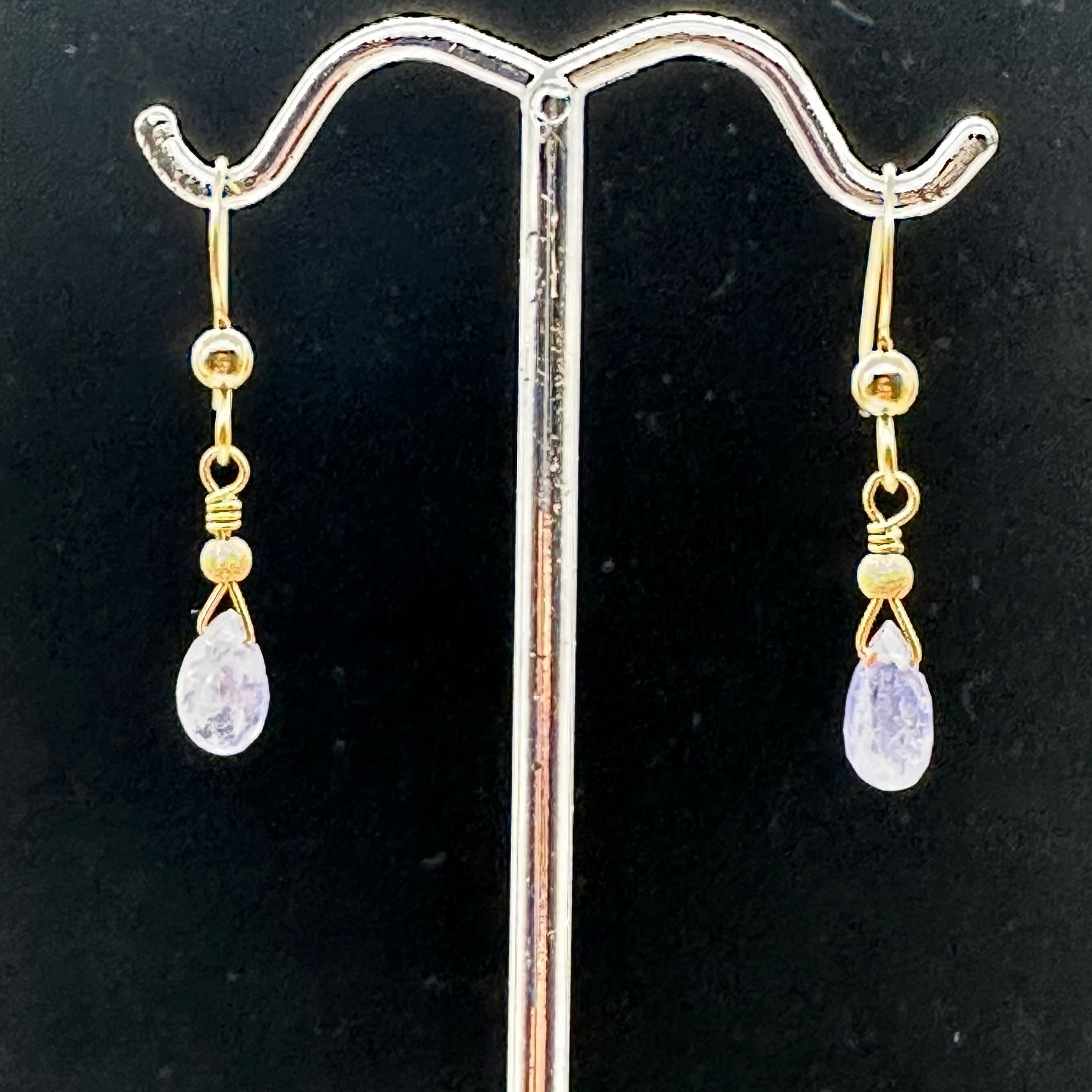 These charming 14K gold filled drop earrings feature luminous lavender Tanzanite beads. Designed with yellow gold fish hook ear wires for comfort and ease, these earrings offer timeless elegance with a graceful, delicate swing. Their soft color palette makes them perfect for both everyday wear and special occasions.