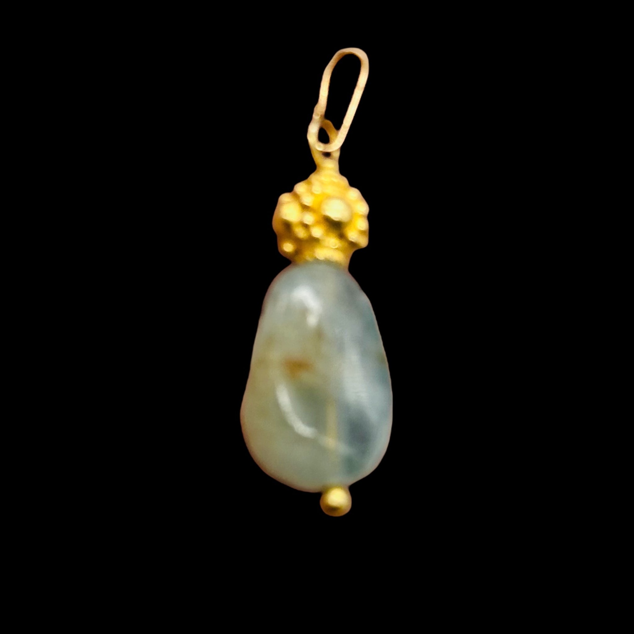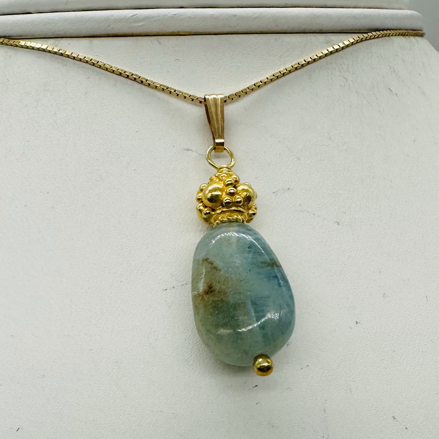 This stunning Aquamarine pendant radiates elegance with its natural nugget-shaped bead design and soothing aqua-blue hue. Handcrafted with 14K gold-filled findings, this pendant offers a touch of glamour and timeless beauty, making it the perfect accent for any wardrobe. Its semi-translucent quality catches the light beautifully, enhancing its natural charm.