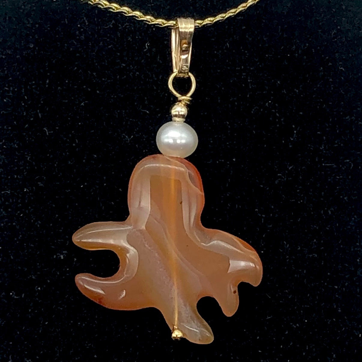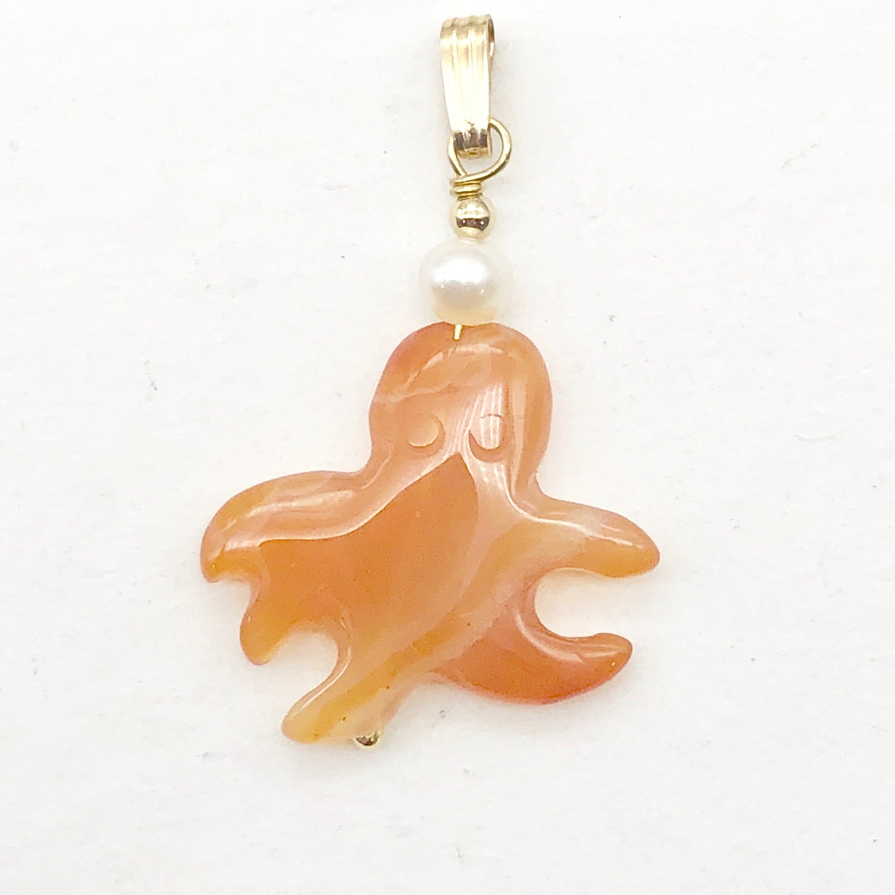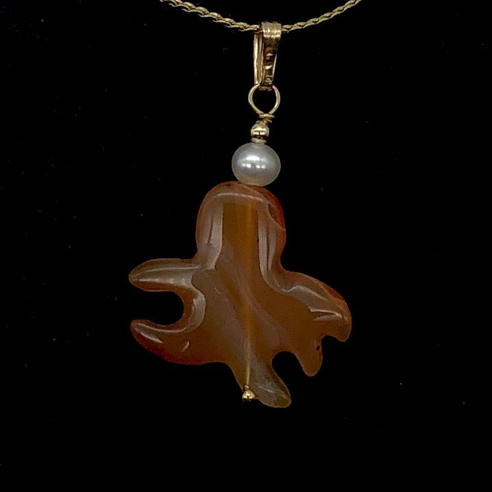 Carved Red Orange Carnelian Octopus 14kgf Pendant with Pearl Accent Bead!