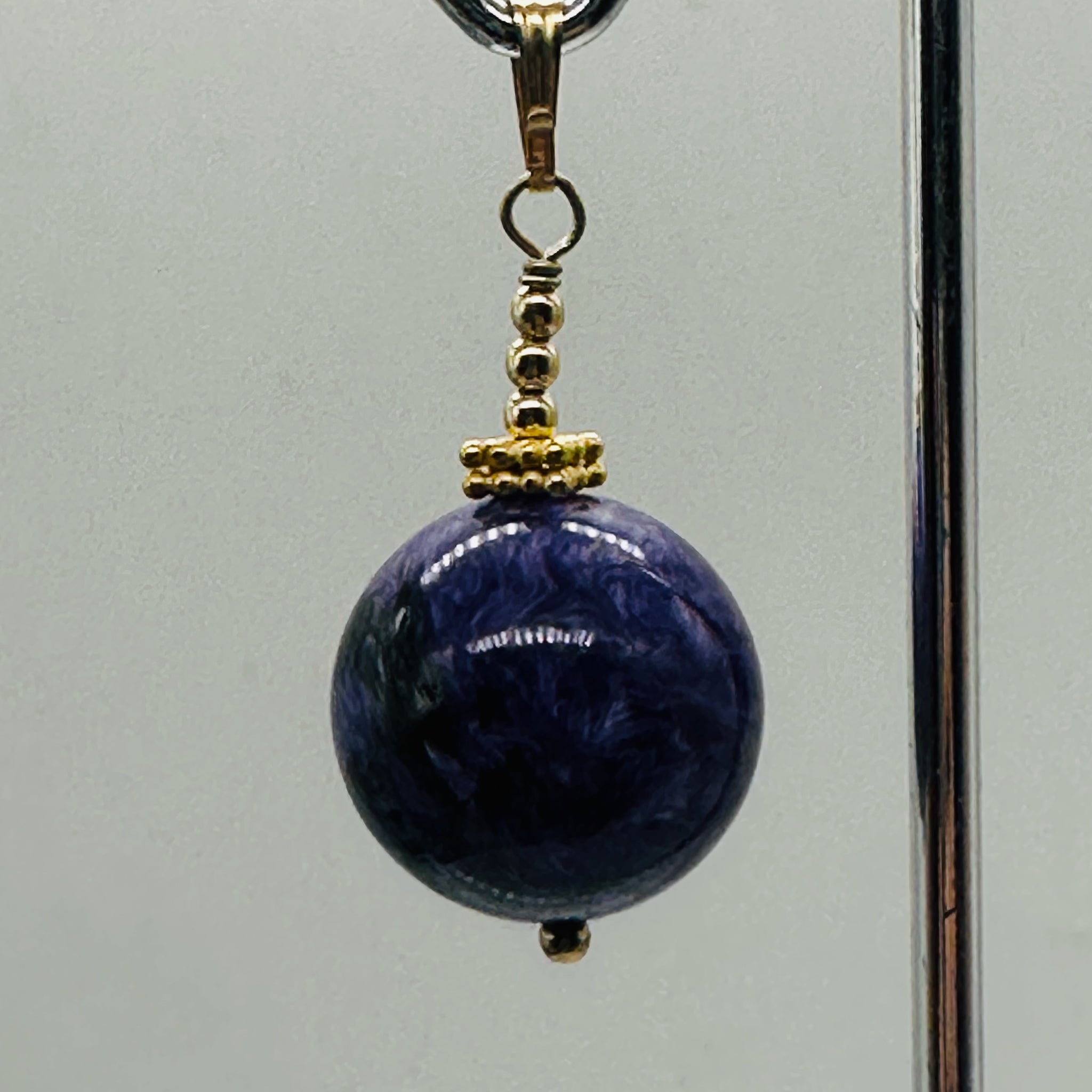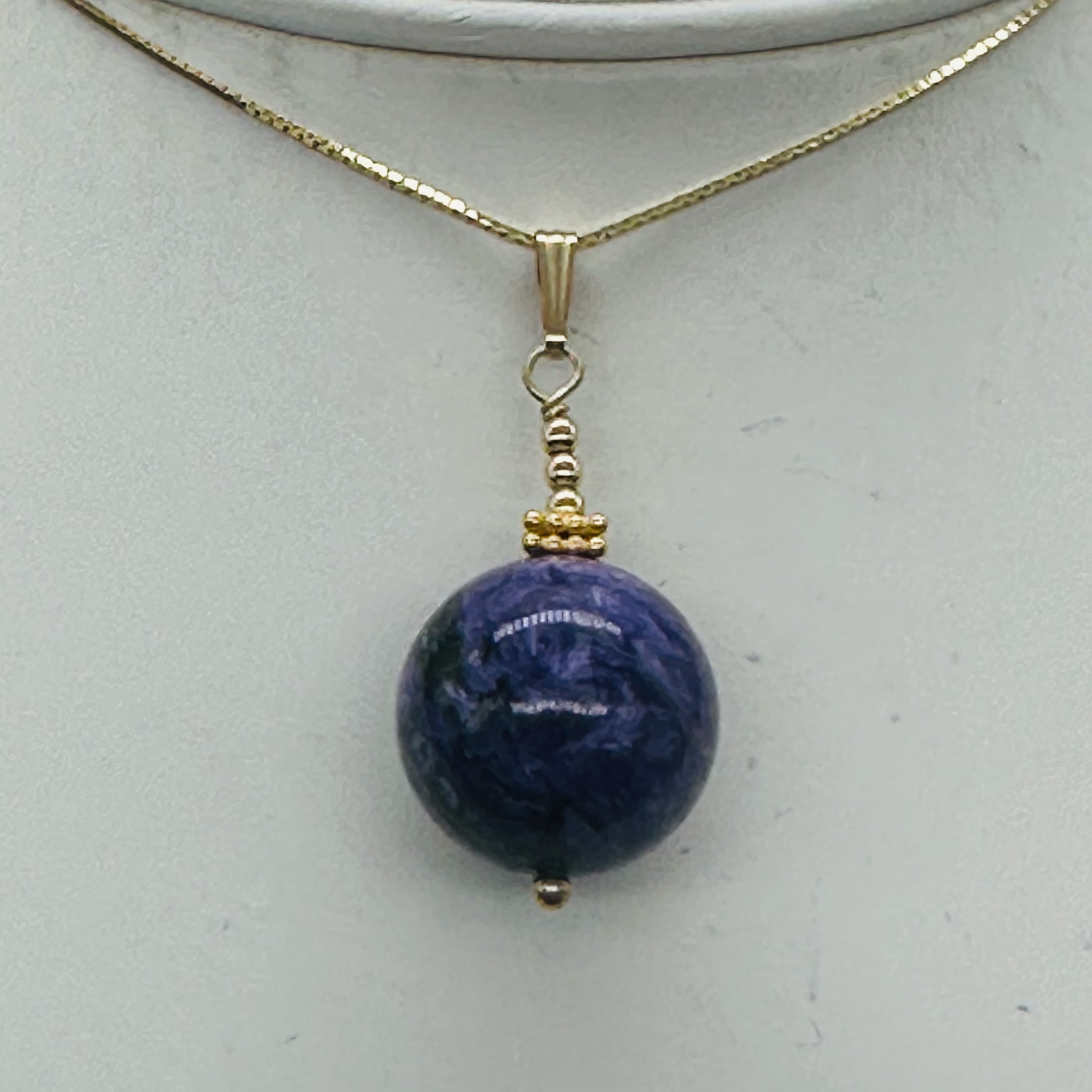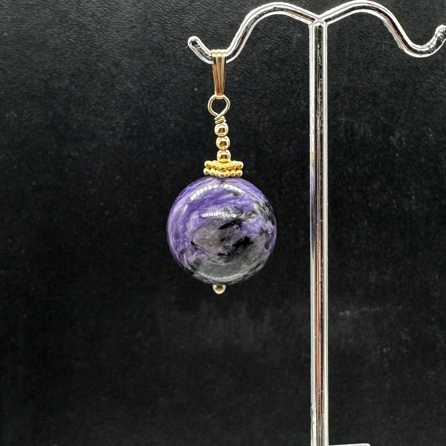 This exquisite pendant features an 18mm AAA-grade Charoite round bead wrapped in elegant 14K gold-filled findings. The swirling patterns of rich purple and soft white create a mesmerizing, marbled effect that makes this piece an unforgettable focal point for any necklace. With its smooth finish and luxurious color play, this pendant is perfect for collectors, designers, or anyone seeking a truly unique gemstone treasure.