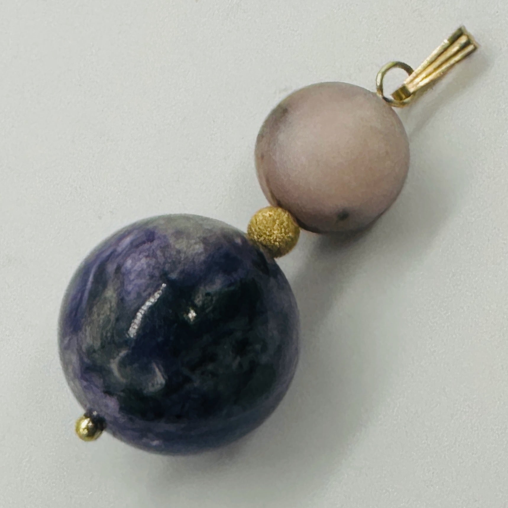 This breathtaking pendant pairs rare, swirling purple Charoite with soft, soothing Pink Peruvian Opal, all wrapped in luxurious 14K gold-filled findings. Measuring 1 7/8" long, this graceful dangle pendant showcases a harmonious blend of purple, white, and gentle pink tones - a dreamy palette that elevates any jewelry design. Each gemstone brings its own natural beauty and distinctive character, making this piece a standout focal point rich with meaning and artistry.