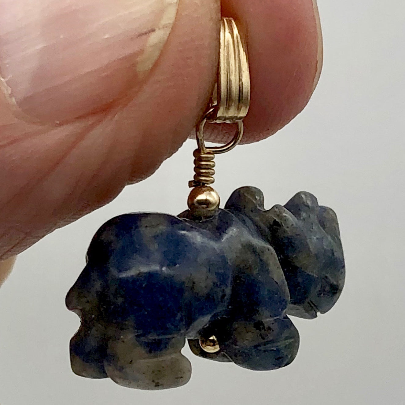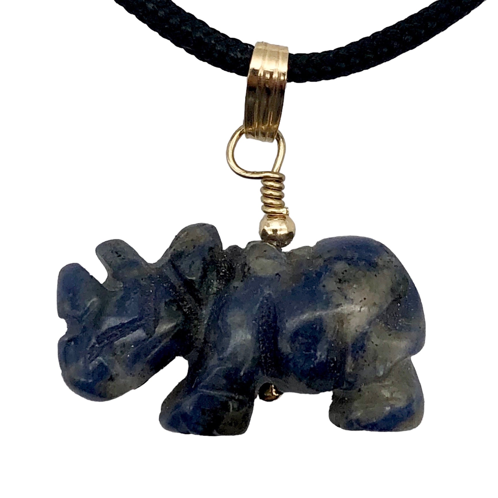 This is for one Hand carved SODALITE Rhinoceros 14K gold-filled pendant. SODALITE is a stone that is a navy blue base with white clouds of albite throughout!