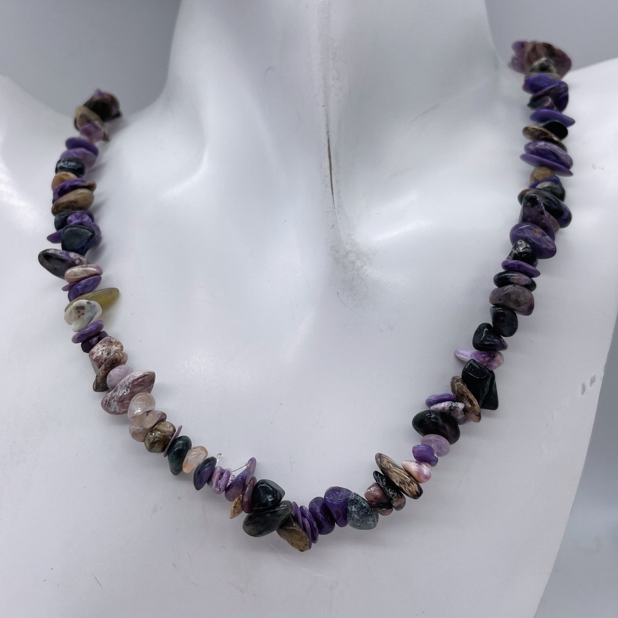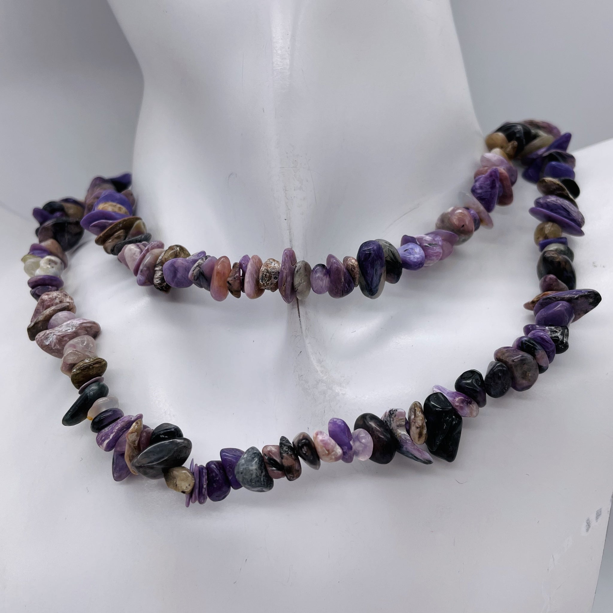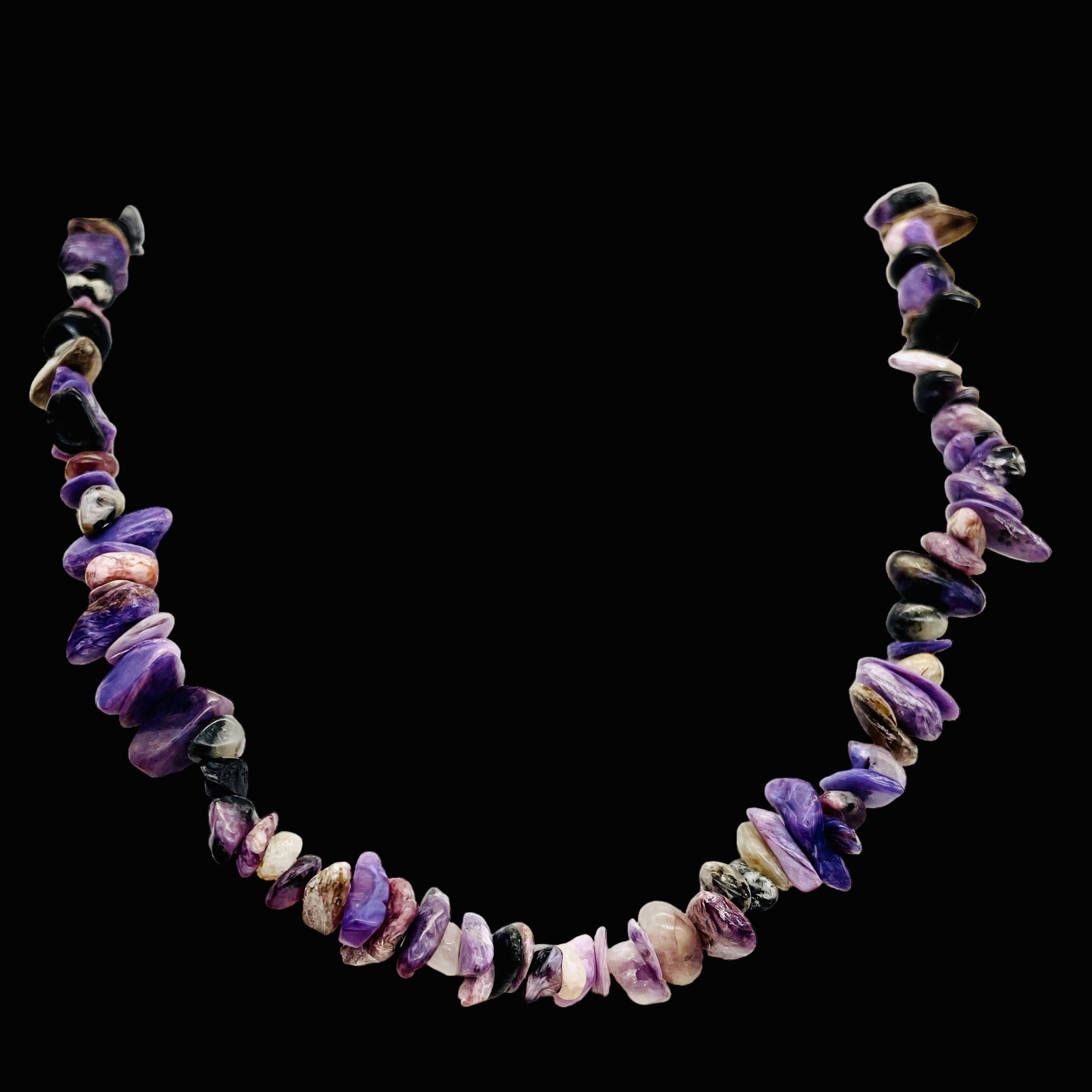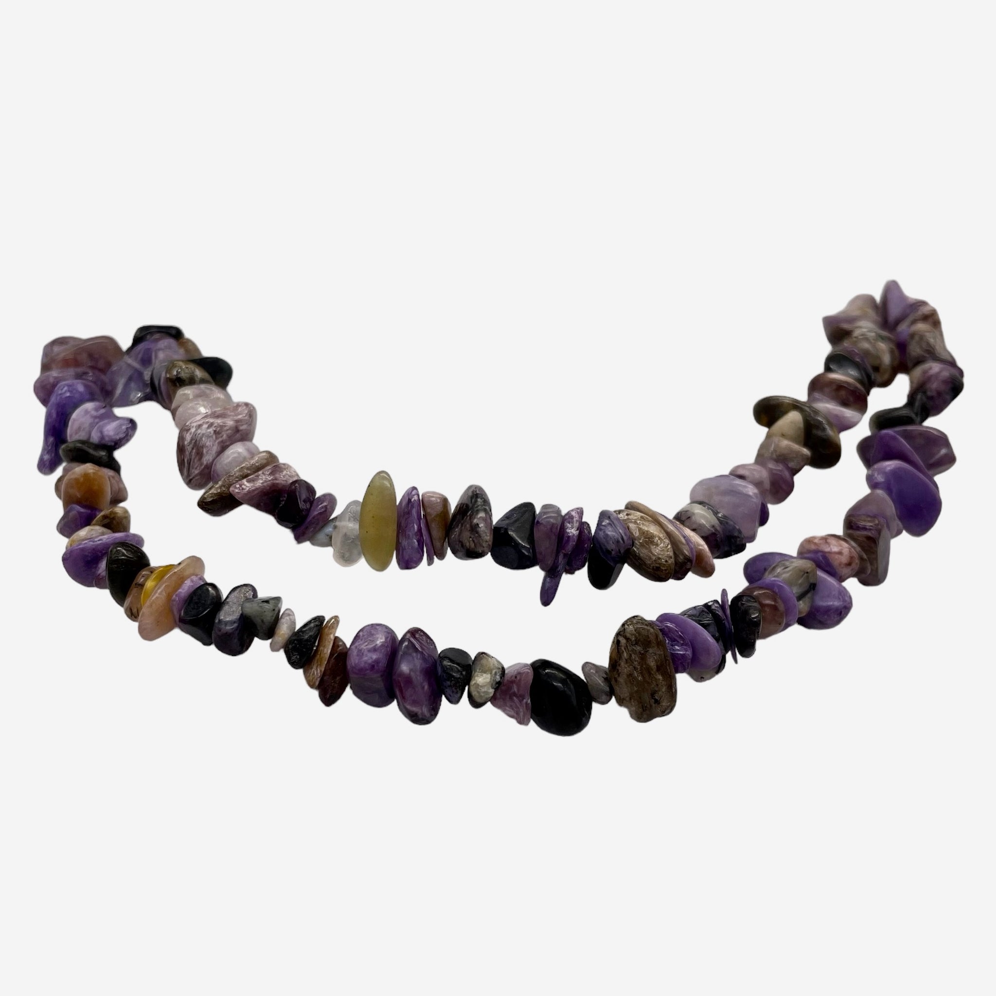 Each bead in this 32" chip strand showcases the mesmerizing beauty of Charoite. Known as a "stone of transformation," Charoite is believed to aid in the conversion of negative emotions into positive ones. It is also said to encourage inner strength, assertiveness, creativity, and self-esteem. With its deep transformative properties and bold energy, Charoite is a soul stone that offers emotional healing and spiritual strength. It helps regulate us in the best possible ways, offering high vibrations and a divine touch.