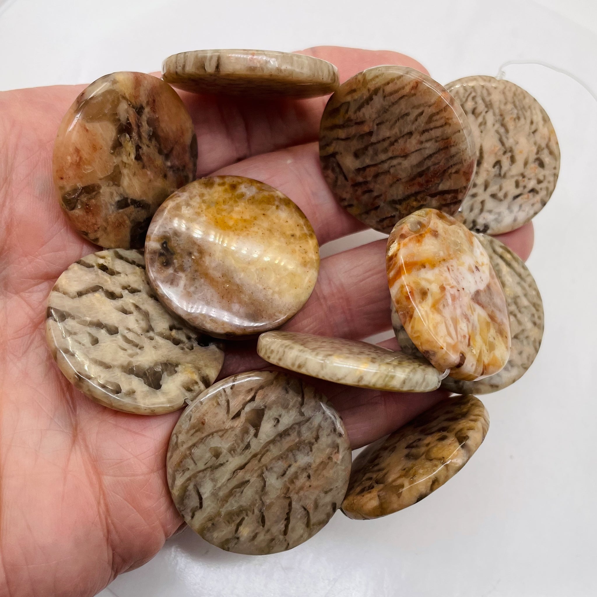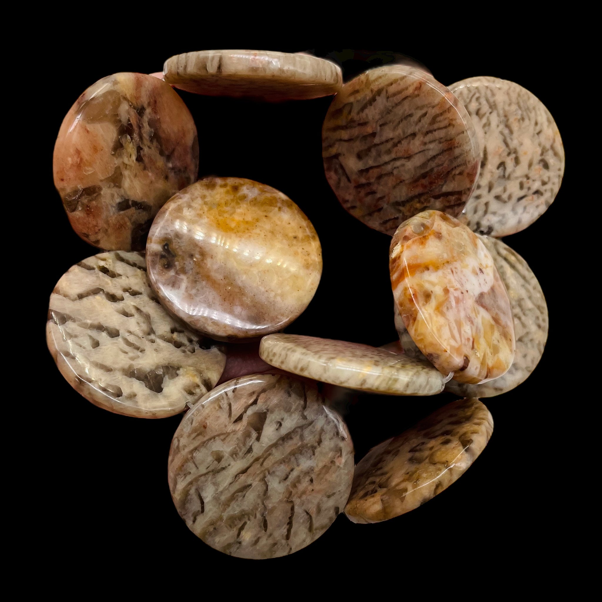 Black Red Tan Feldspar Coin Strand of Beads for Jewelry Making.