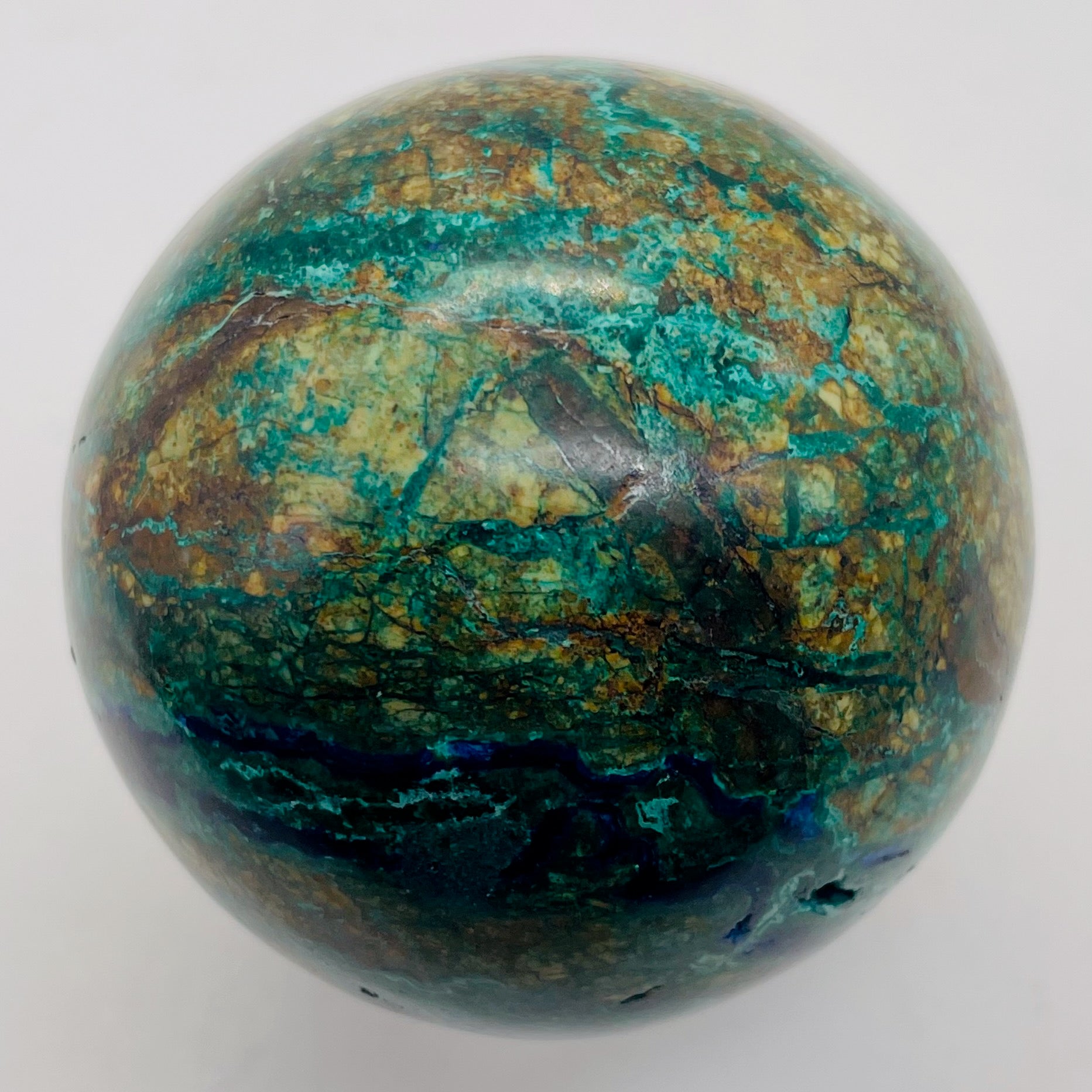 This beautiful Green/Blue/Brown Azurite Chrysocolla sphere is a wonderful display piece to gaze at and lose yourself in as you drift through your conscious and unconscious memories. You can drop into a deep meditative state with its aid. Swirling rivers of Azurite and Chrysocolla running through brown canyons.