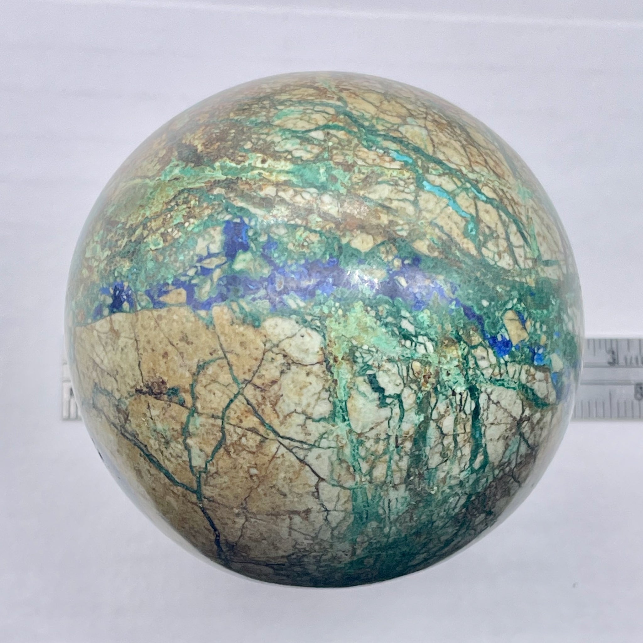This beautiful Green/Blue/Brown Azurite Malachite sphere is a wonderful display piece to gaze at and lose yourself in as you drift through your conscious and unconscious memories. You can drop into a deep meditative state with its aid. There is a solid vein of Azurite running through the middle.