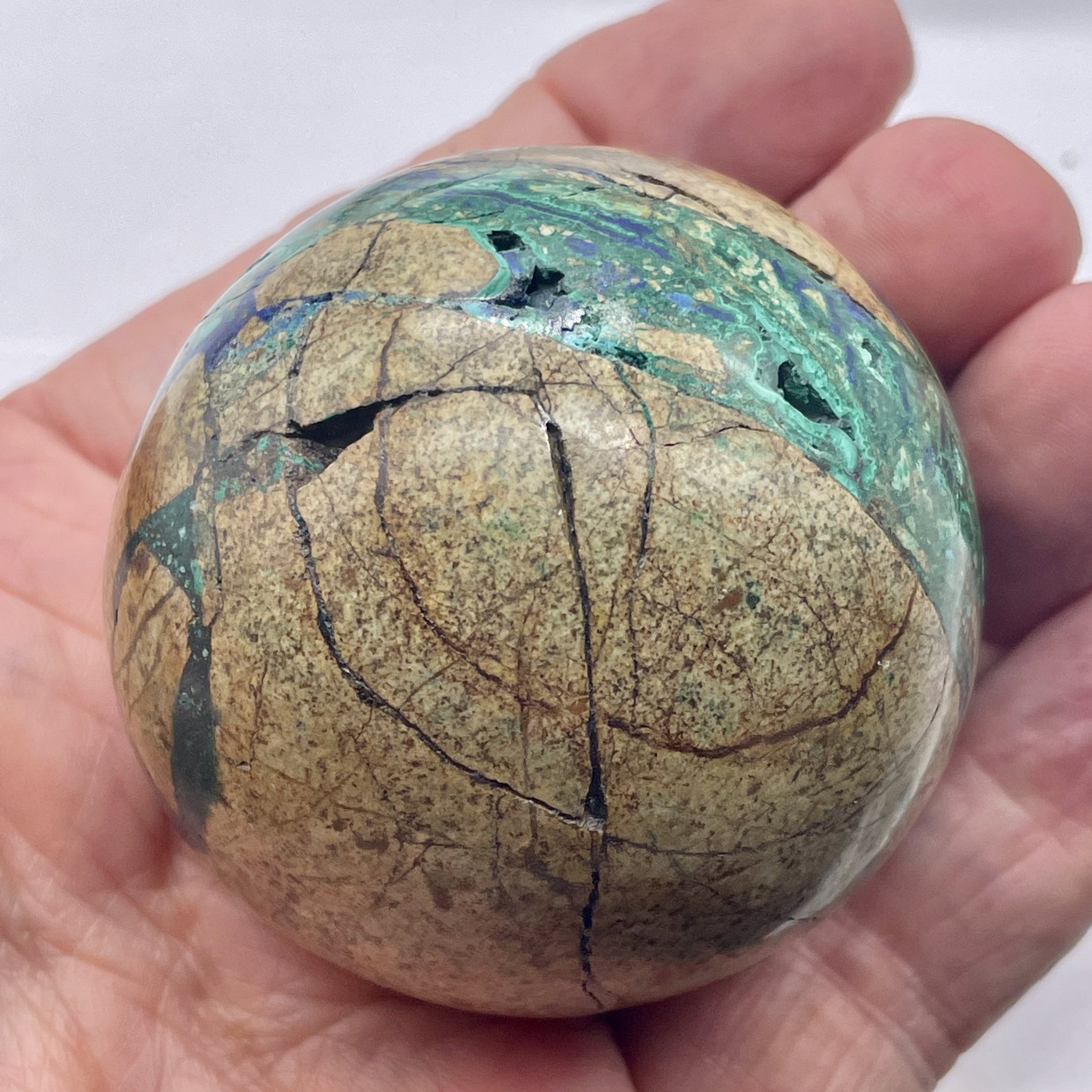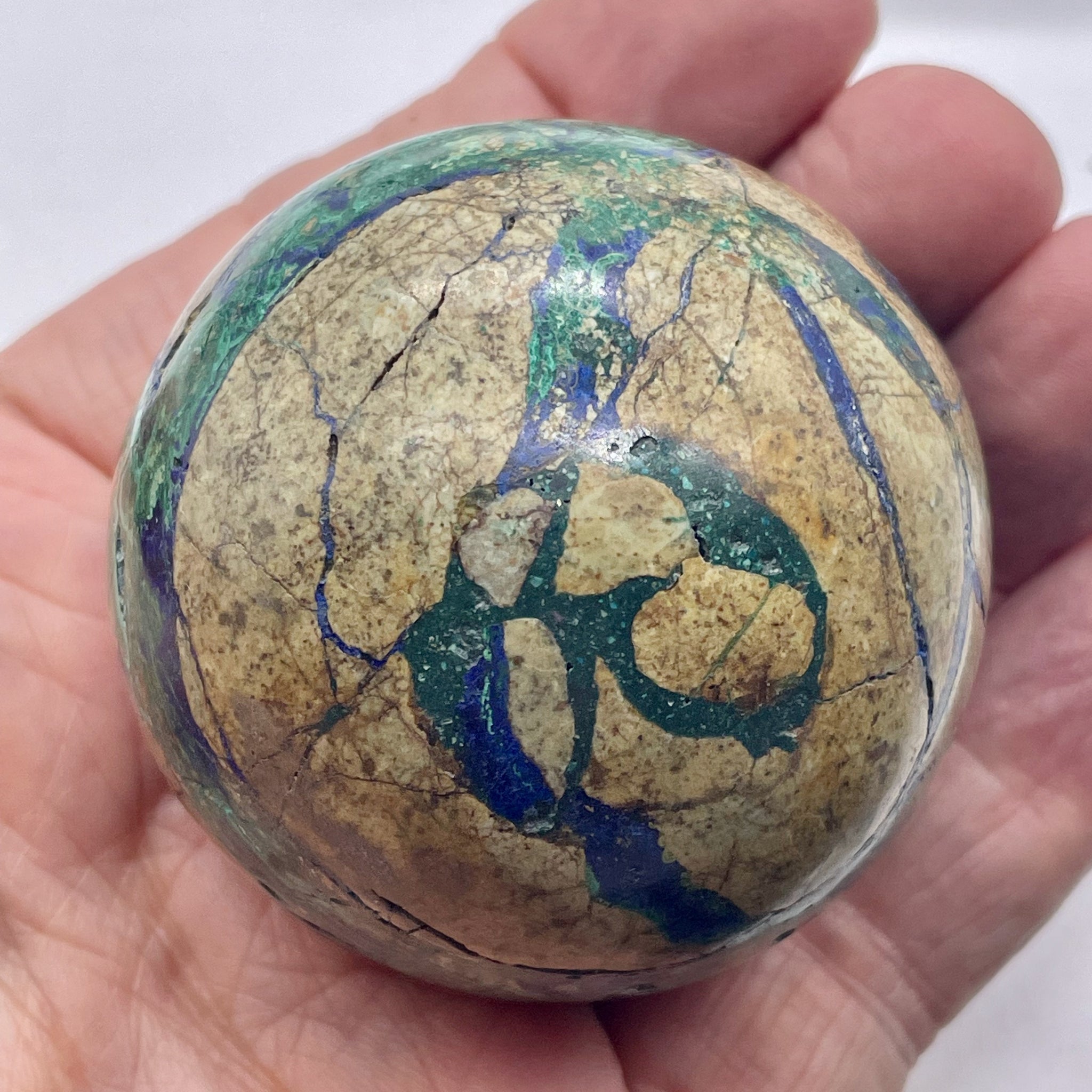 This beautiful Green/Blue/Brown Azurite Malachite sphere is a wonderful display piece to gaze at and lose yourself in as you drift through your conscious and unconscious memories. You can drop into a deep meditative state with its aid. Swirling rivers of Azurite and Malachite rnning through brown canyons.