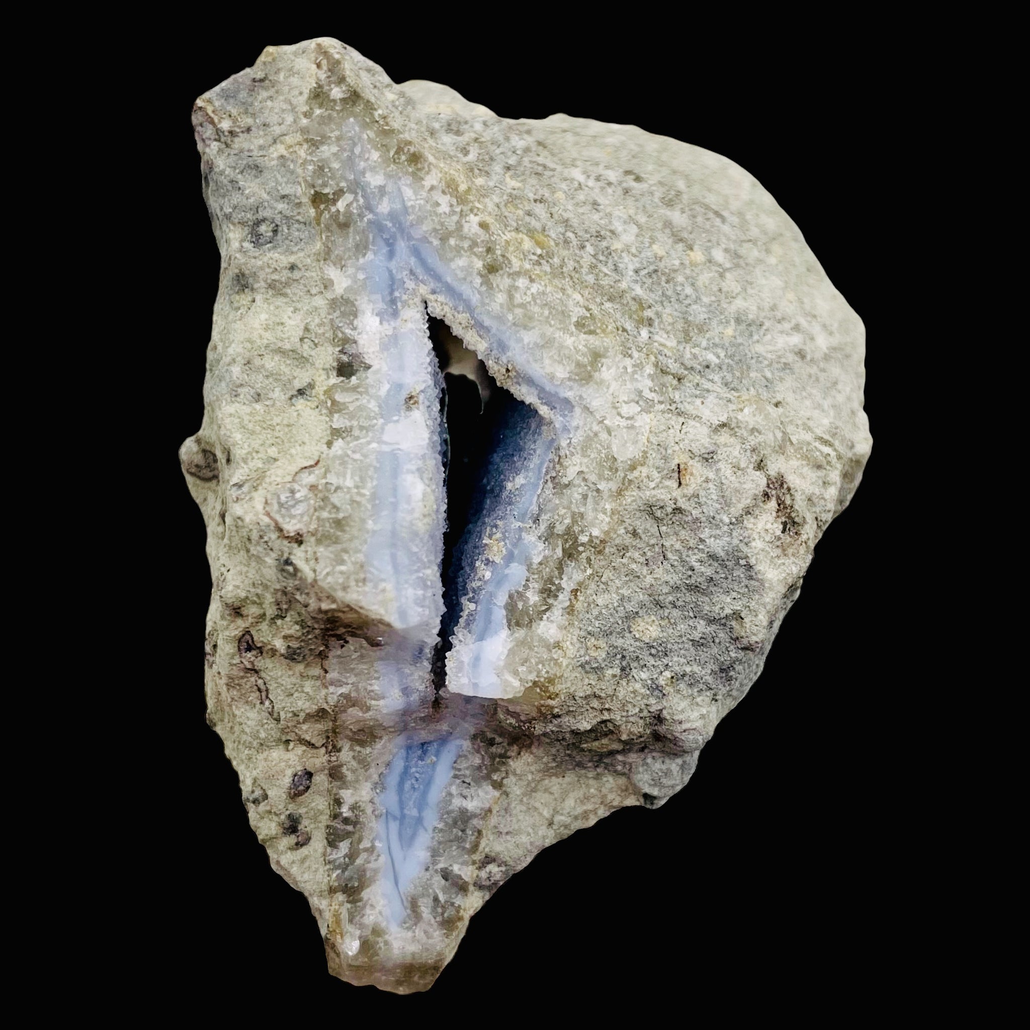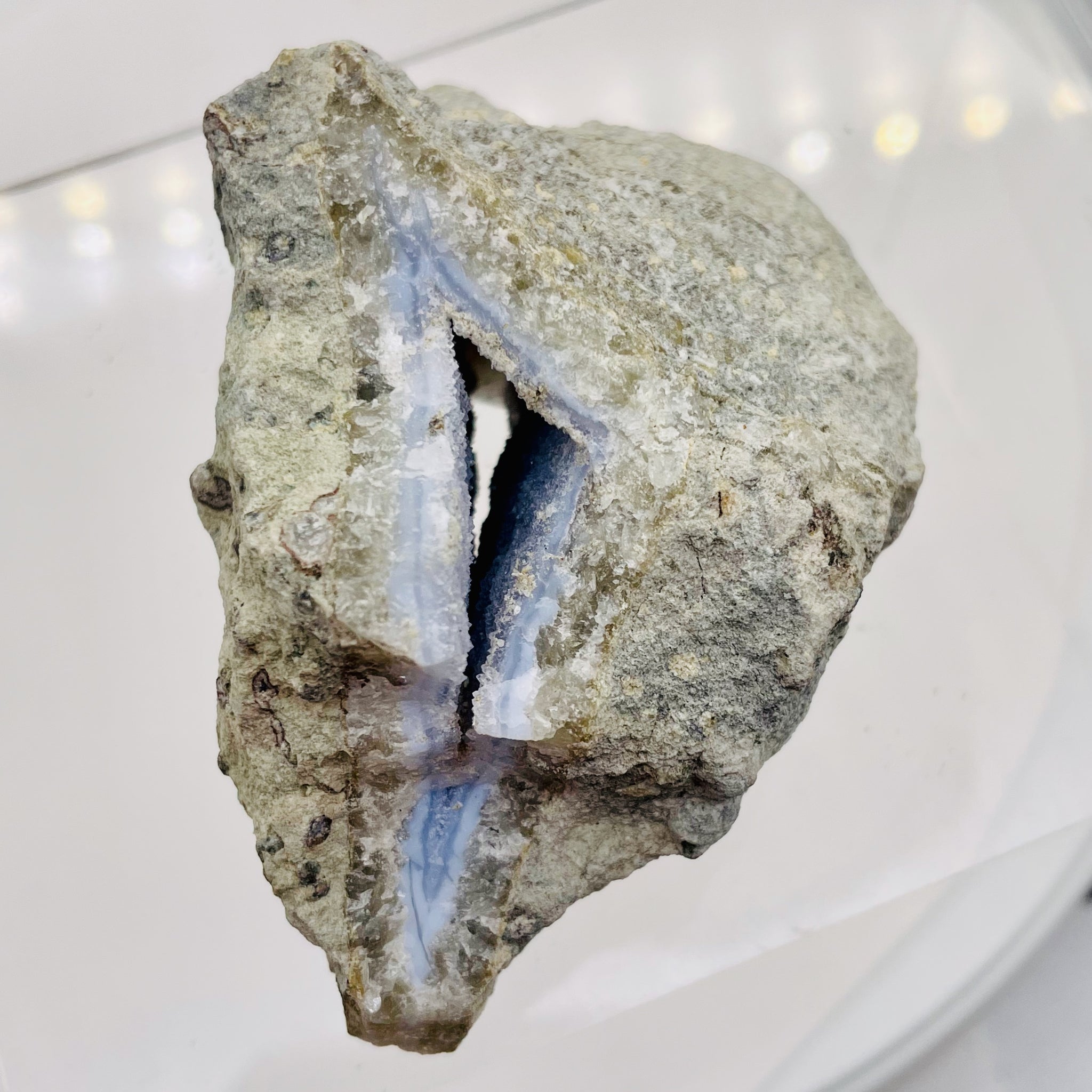 Discover the captivating beauty of this White Blue Chalcedony Quartz Specimen. Meticulously crafted, it features a tunneled formation adorned with Blue Chalcedony and White Druzy Quartz. This one-of-a-kind piece originates from a large deposit in Brazil and has been carefully selected from our collection. Feel the remarkable energy as it tingles through your fingers and radiates throughout your body. Embrace the nurturing qualities of Chalcedony, promoting brotherhood and goodwill. Ideal for display or crystal enthusiasts.