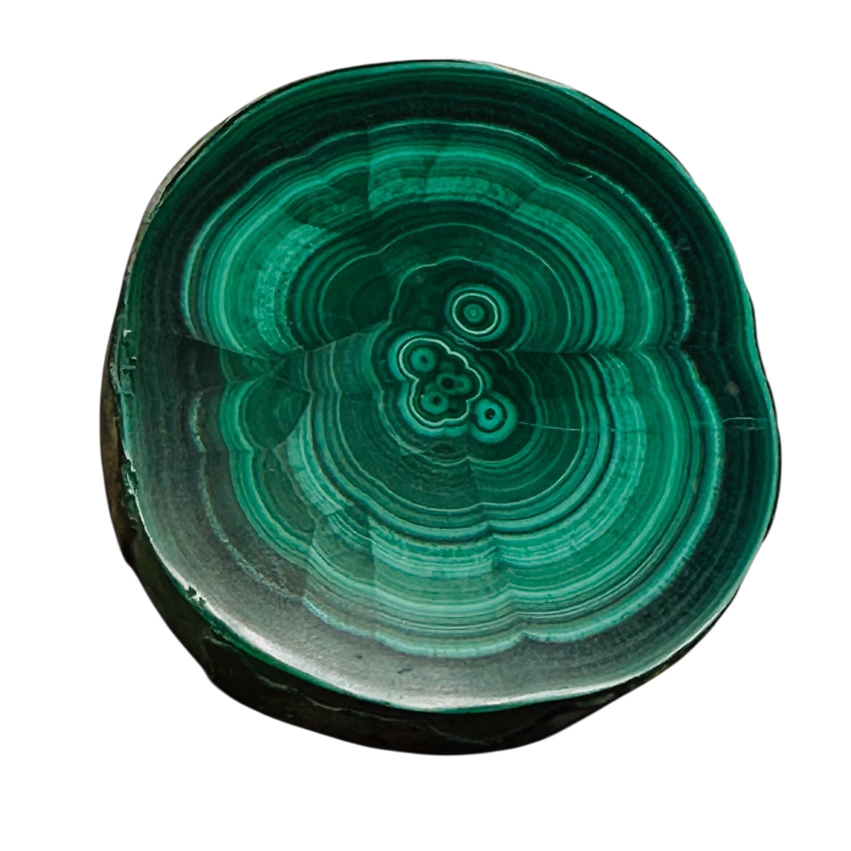 This is a Green Malachite 37g Stalactite Slice Polished Round Slice, perfect for collectors, display, or jewelry making. The slice showcases Malachite's stunning banded green patterns, polished to reveal its natural beauty. Its unique concentric rings and rich color make it a striking piece for any collection or a wonderful centerpiece for creative designs.