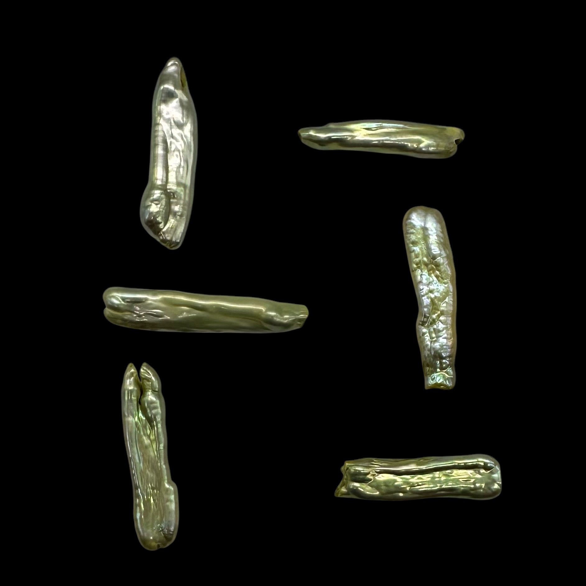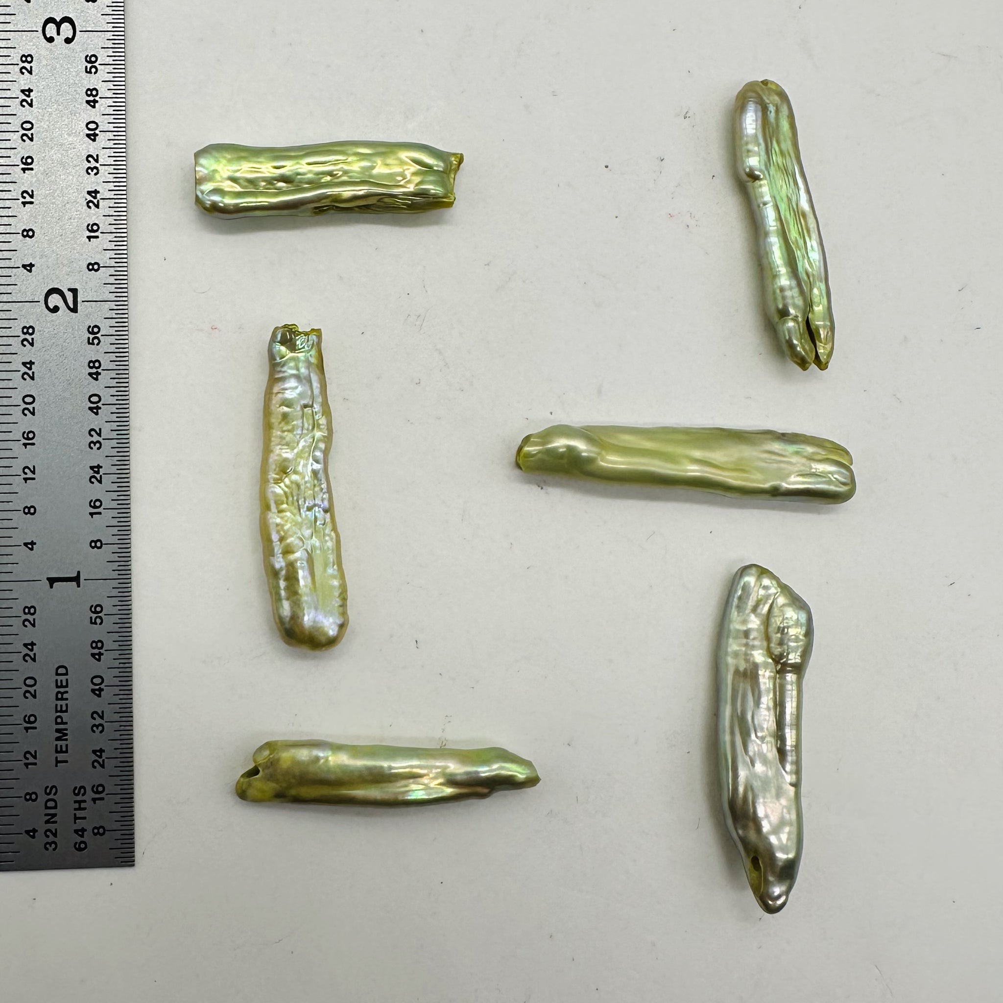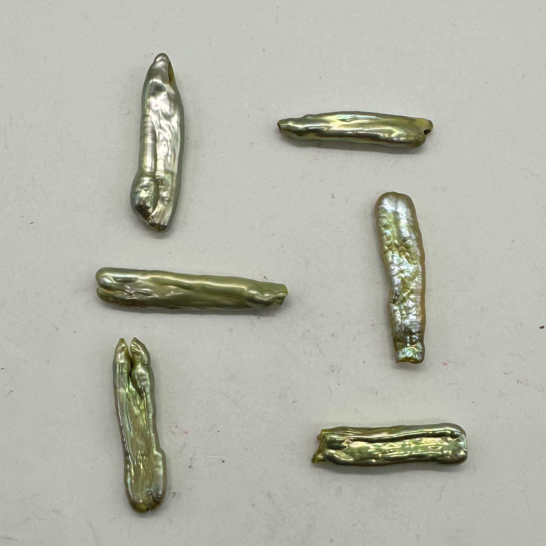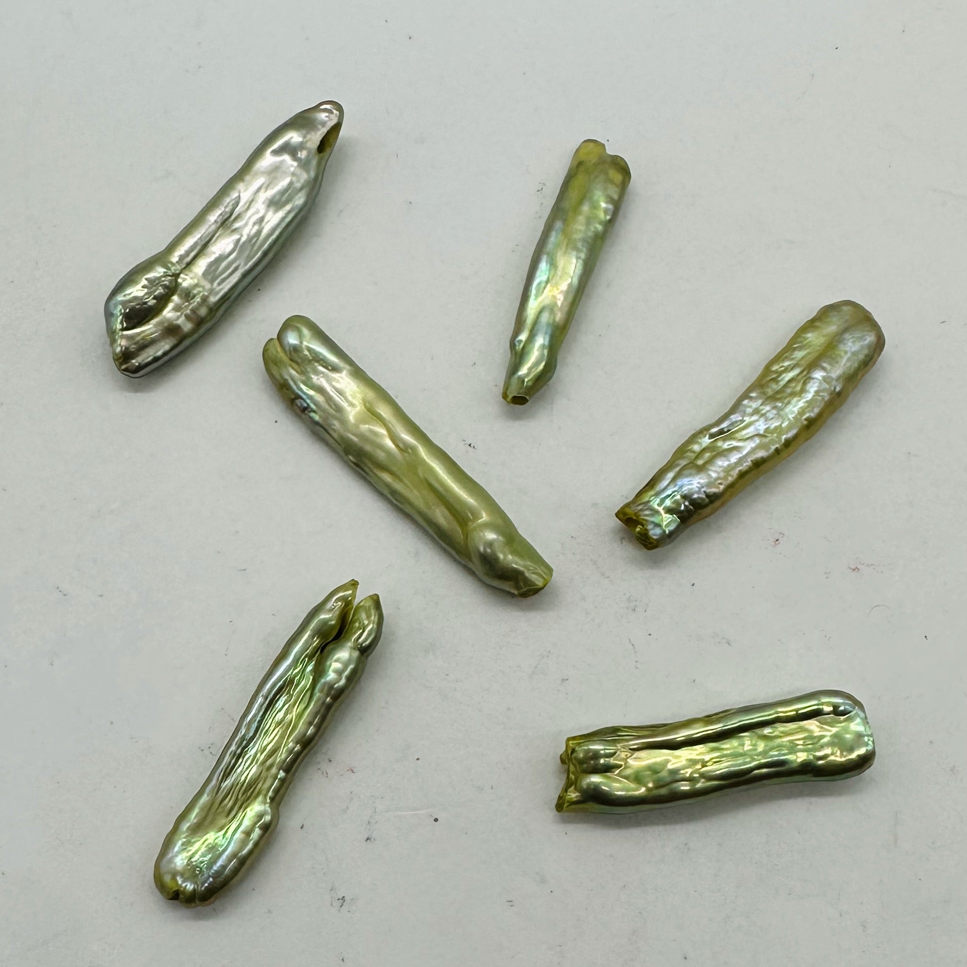 These stunning Biwa-style freshwater pearls shimmer with a unique pistachio green hue and subtle flashes of rose, lavender, and gold. This listing is for 6 fully drilled pearls, measuring between 20x7x5mm and 34x7x5mm. Each one is a work of art, shaped in elegant stick-like forms that radiate both boldness and grace.