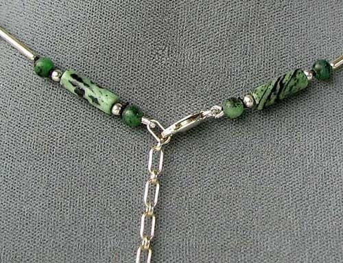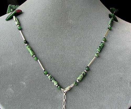 These beads are uniquely cut natural ruby zoisite that make a very interesting necklace when combined with sterling silver accent beads and chain! These Ruby Zoisite beads are absolutely the most incredible combination of brilliant forest green Zoisite, spotted randomly with black lattice matrix and highlighted with gorgeous brilliant RUBY!!! This absolutely wonderful piece is finished of with sterling silver chain and a lobster clasp that allows for an adjustable length of 20-24". This necklace would make a great addition to your wardrobe. Don't miss out!!
