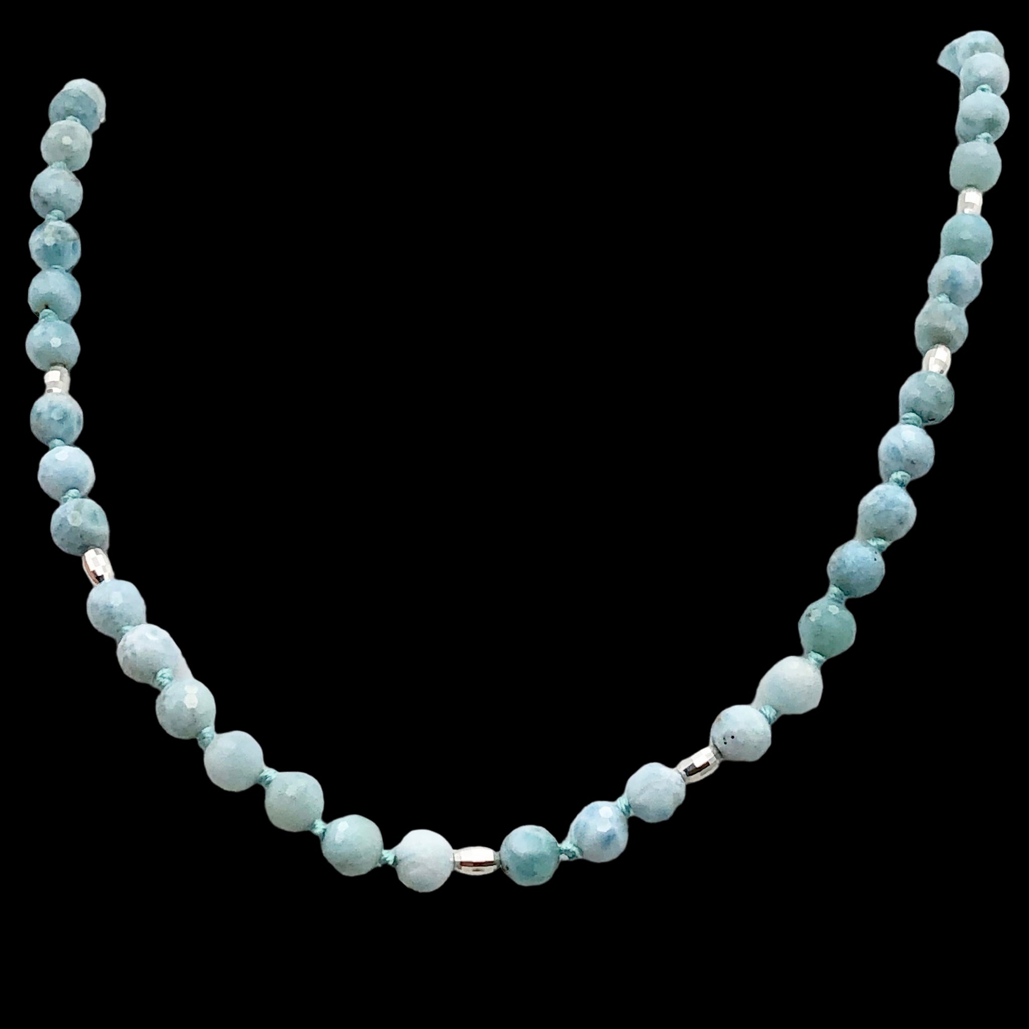 Blue Larimar Faceted Round Bead Necklace with Sterling Silver Accents.