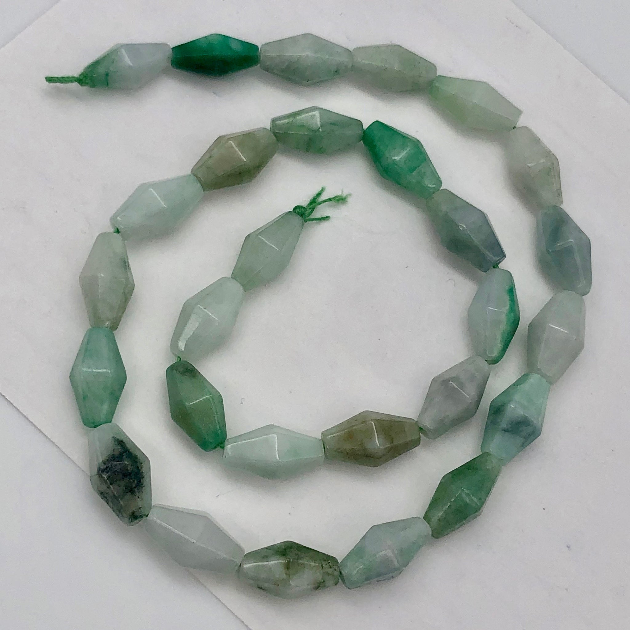 This is for 1 temporarily strung 8" strand of GORGEOUS JADE Unusual Facet beads!! Do not confuse these wonderful beads with ones out of nephrite jade! This is the real thing: beautiful, semi-translucent jadeite!! I got a fabulous deal on these beads and am passing it on to you! These are some of the most beautiful beads I have had the pleasure to meet! These are the perfect size and shape to use solo or blend with other beads or pearls. These beads vary from a wonderful refreshing minty green to a deep forest green to pale snow jade to emerald some beads are a mix of all or some of these colors too!!! There are a few black dendrite inclusions in some of the beads. These beads of lovely AAA JADEITE are a unique addition to any bead or jade collection. Some stone energy people also say Jade is very healing physically and especially for the kidneys!! It has also been said to bring one's true love into their circle!!
