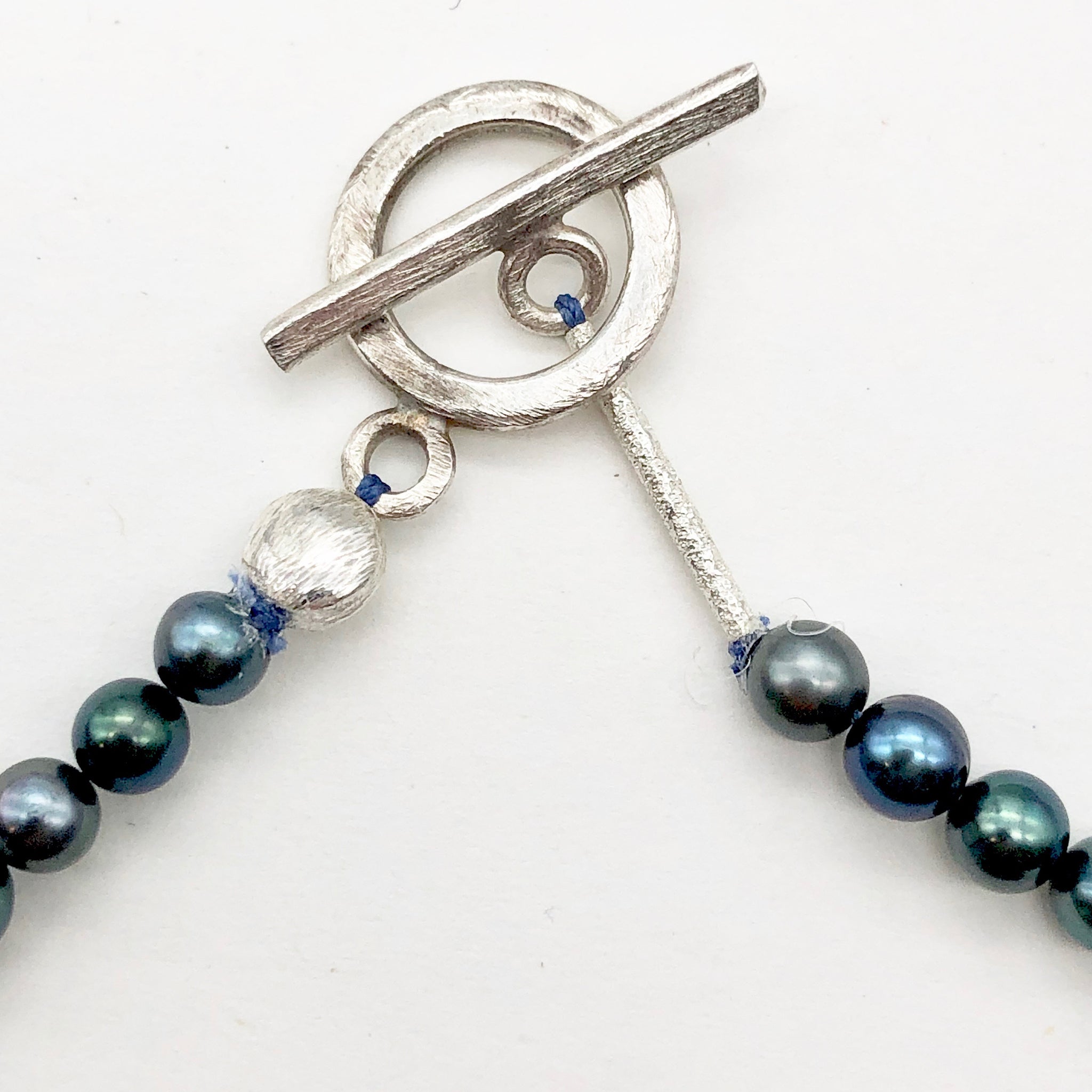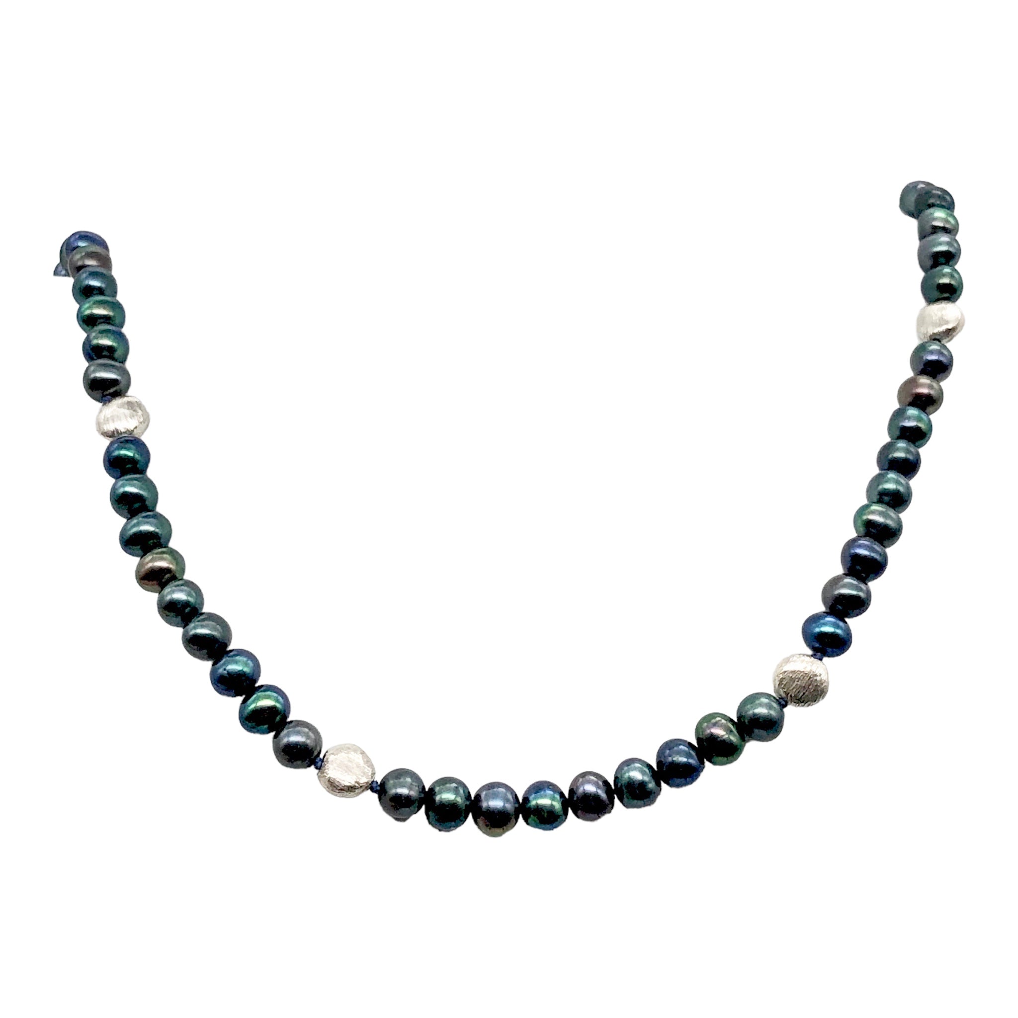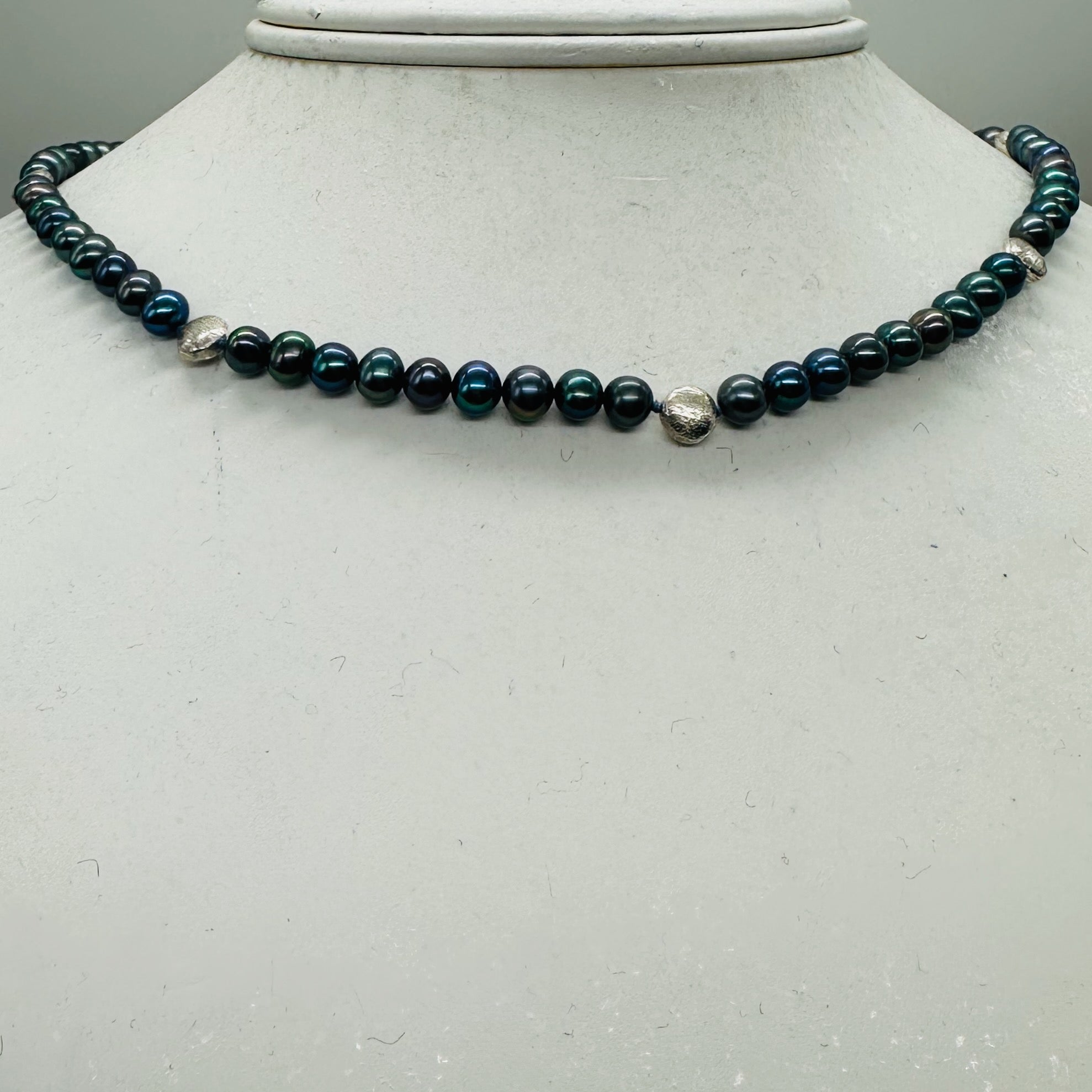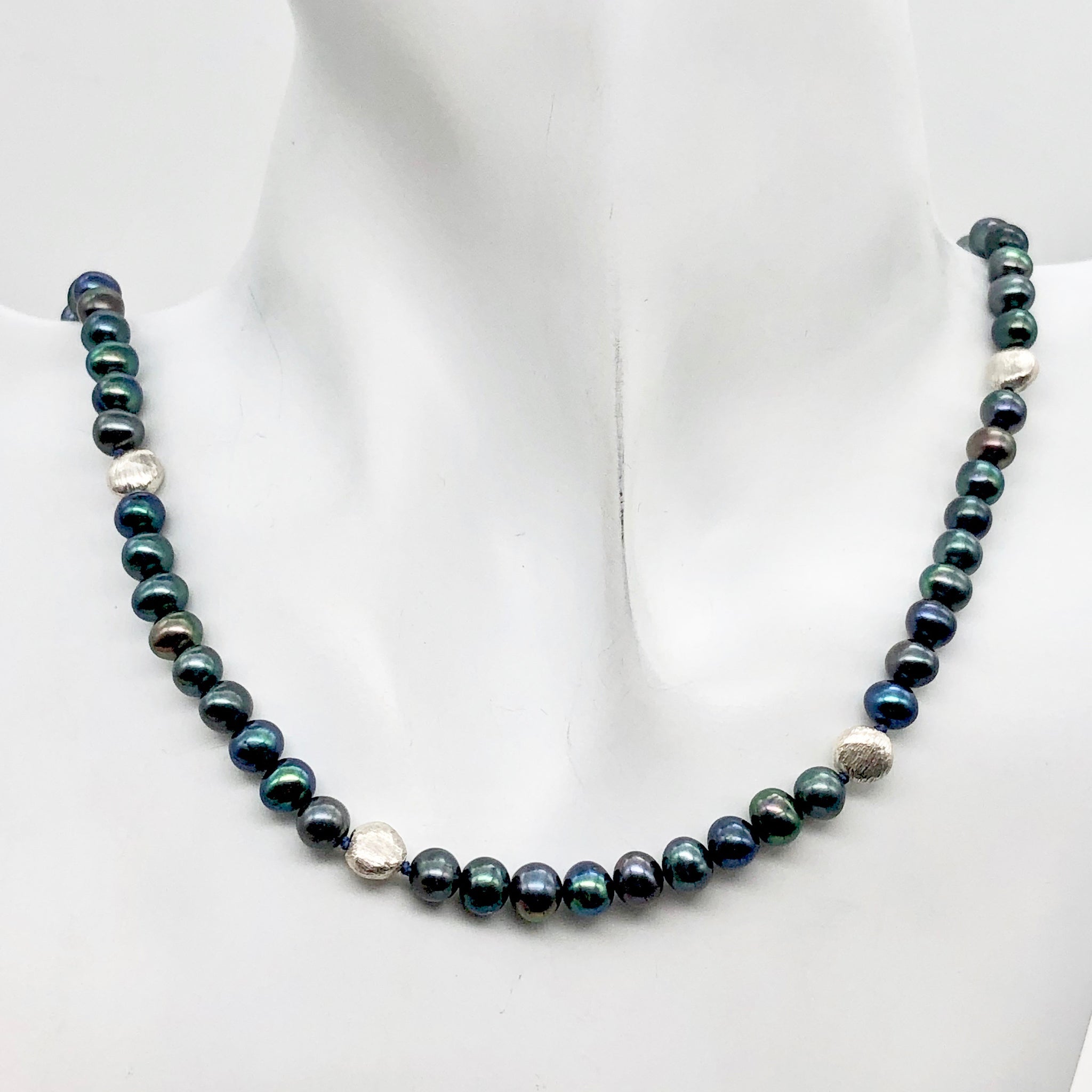 This is for one 20 1/2" necklace of gorgeous freshwater pearls!! These gorgeous pearls are perfect for any wardrobe! These beautiful Fresh Water Pearls speak of luxury and elegance!! These sea 'gems' are complimentary to every skin tone. The background color on these pearls is a fabulous deep indigo blue drenched in highlights! These pearls exhibit many colors in the rainbow: shimmering blue, luminescent purple, vivid indigo, brilliant aqua, marvelous mauve, lovely lavender and oh so many more! The skin is highly luminescent and extremely rich with color. These pearls have been hand strung and knotted on silk for extra durability. A sterling silver clasp and beads have been used to finish this necklace.