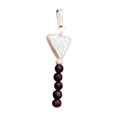 Pearl Triangle and Garnet Sterling Silver Drop Pendant| 1 3/4" Long| White, Red|
