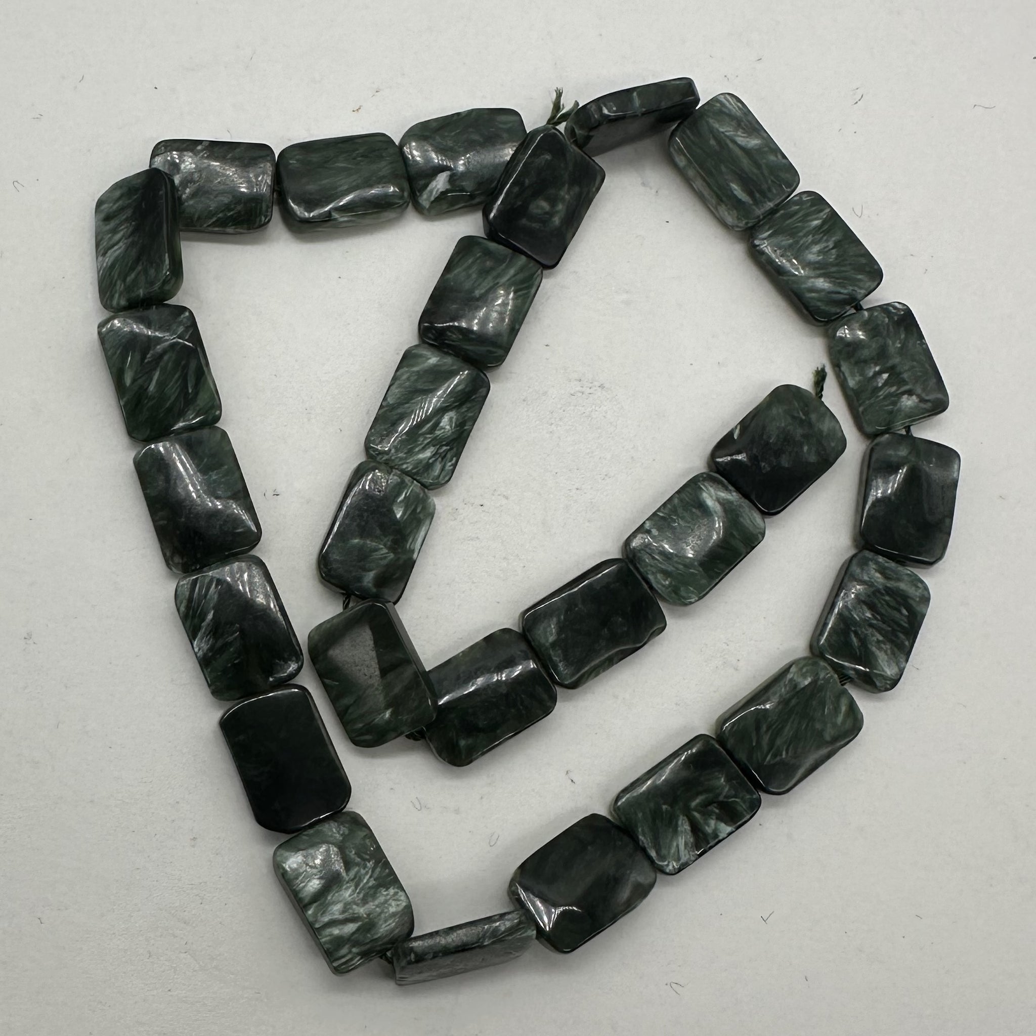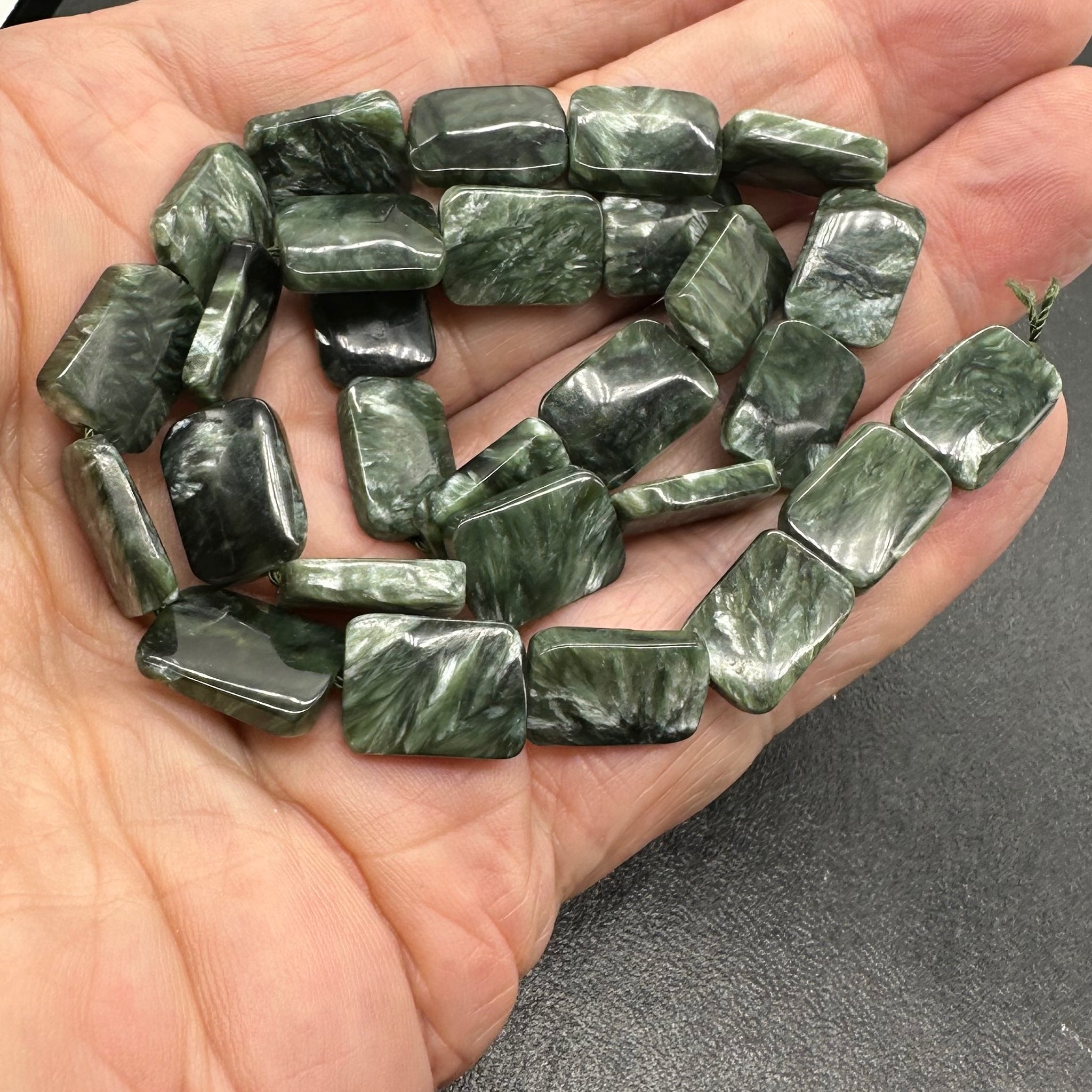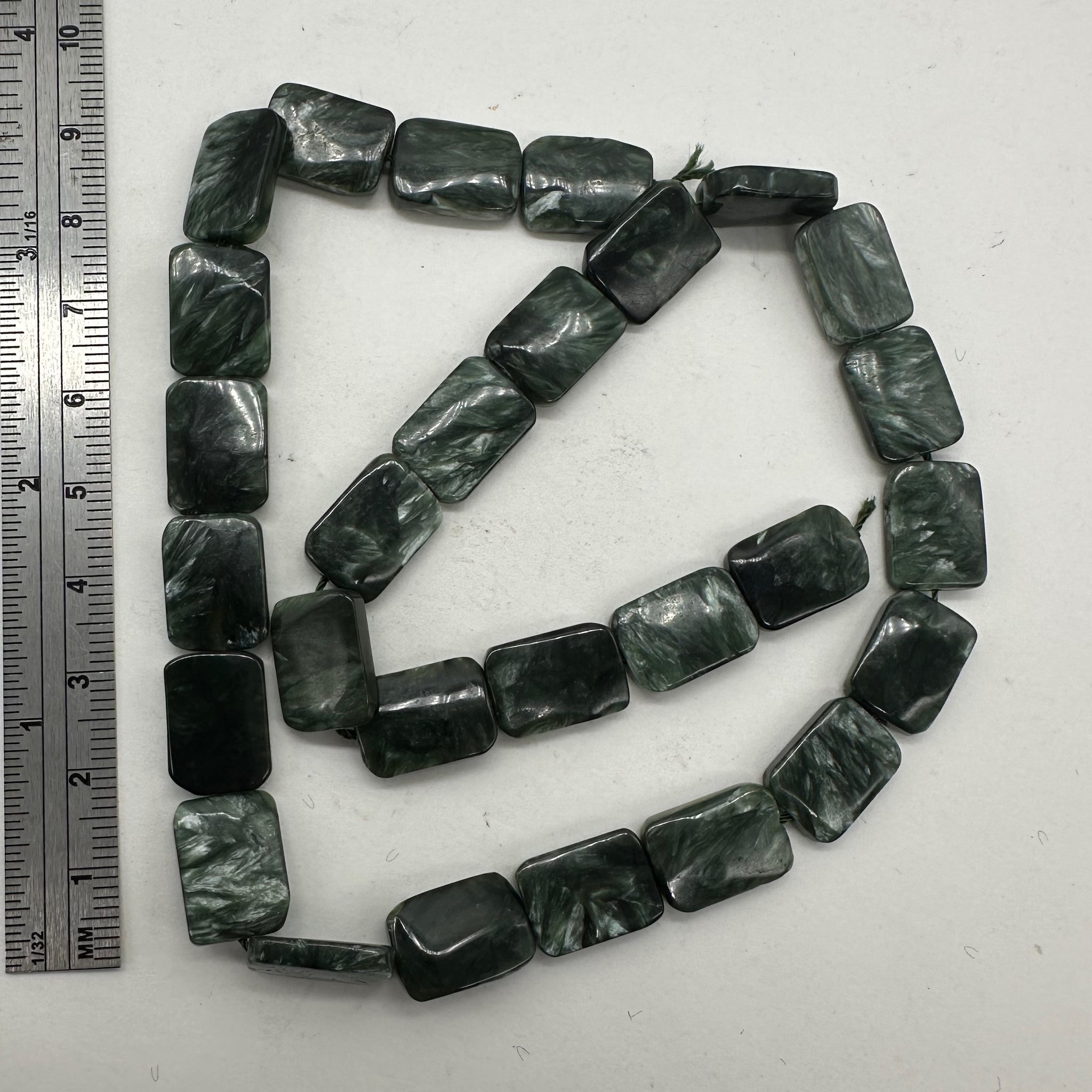 This is for One 16" temporarily strung strand of Seraphinite beads. Seraphinite (seraphinite) is a gemmy variety of clinochlore, a mineral of the chlorite group. Seraphinite originates from the Lake Baykal region of Siberia. These rare gemstones are primarily a deep green color, with feathery inclusions of silver-colored iridescent formations creating intricate chatoyant patterns.