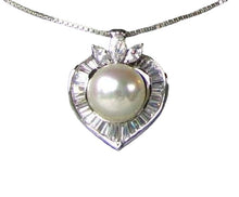 This pearl is 13mm set in Sterling Silver and surrounded with cubics!! The cubics measure 7x4mm to 3x2mm. The pendant measures 31x23mm (1 1/4" x 15/16") including bail. The nacre is thick and satiny smooth!! What a gorgeous pendant this would be for a beautiful bride or a fabulous night out!!