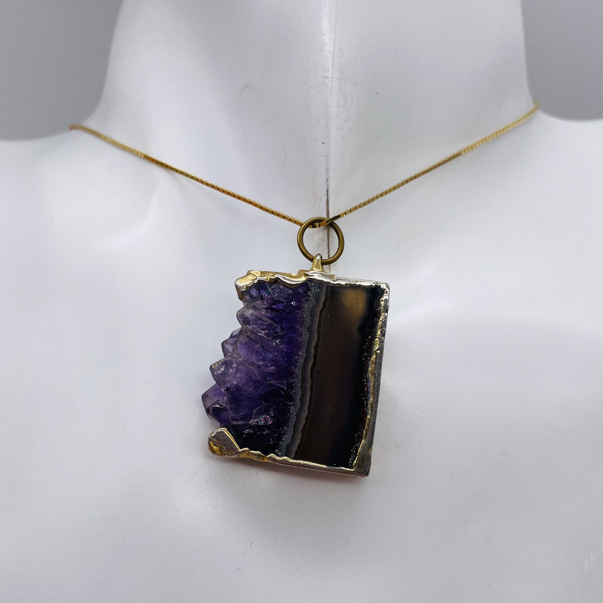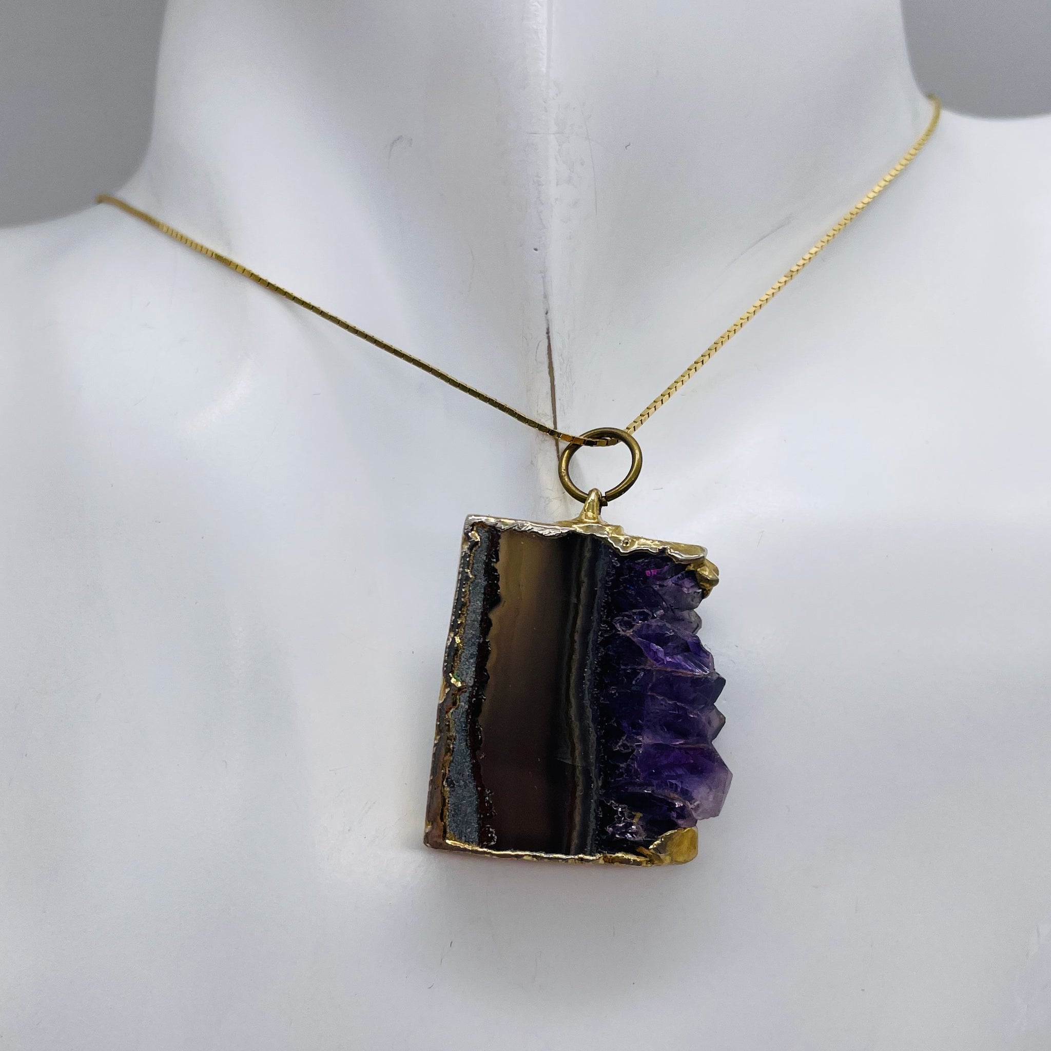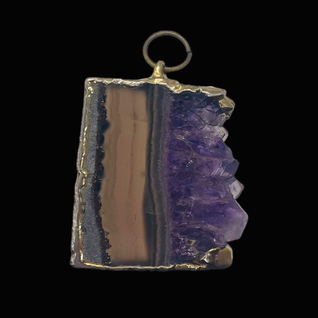 With a size of approximately 1 1/4" long, this pendant is a beautiful statement piece. The legend associated with Amethyst describes its natural tranquilizing properties, making it an ideal choice for stress relief, strain reduction, and soothing irritability. The Amethyst crystal slice used in this pendant is sourced from Brazil, adding to its unique allure.
