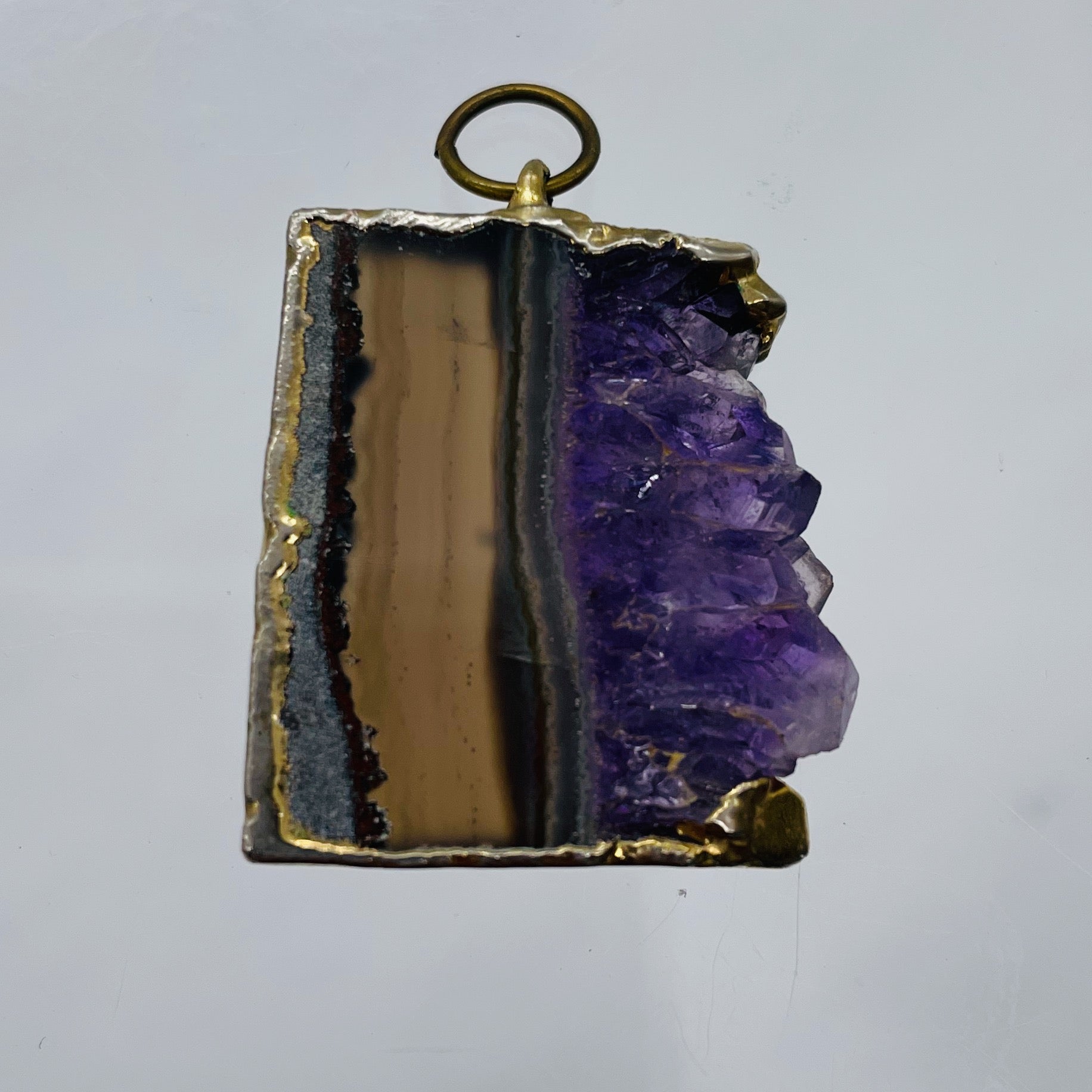 Exquisite pendant featuring a stunning Purple Clear Amethyst Crystal Slice, delicately framed in 18K yellow gold.
