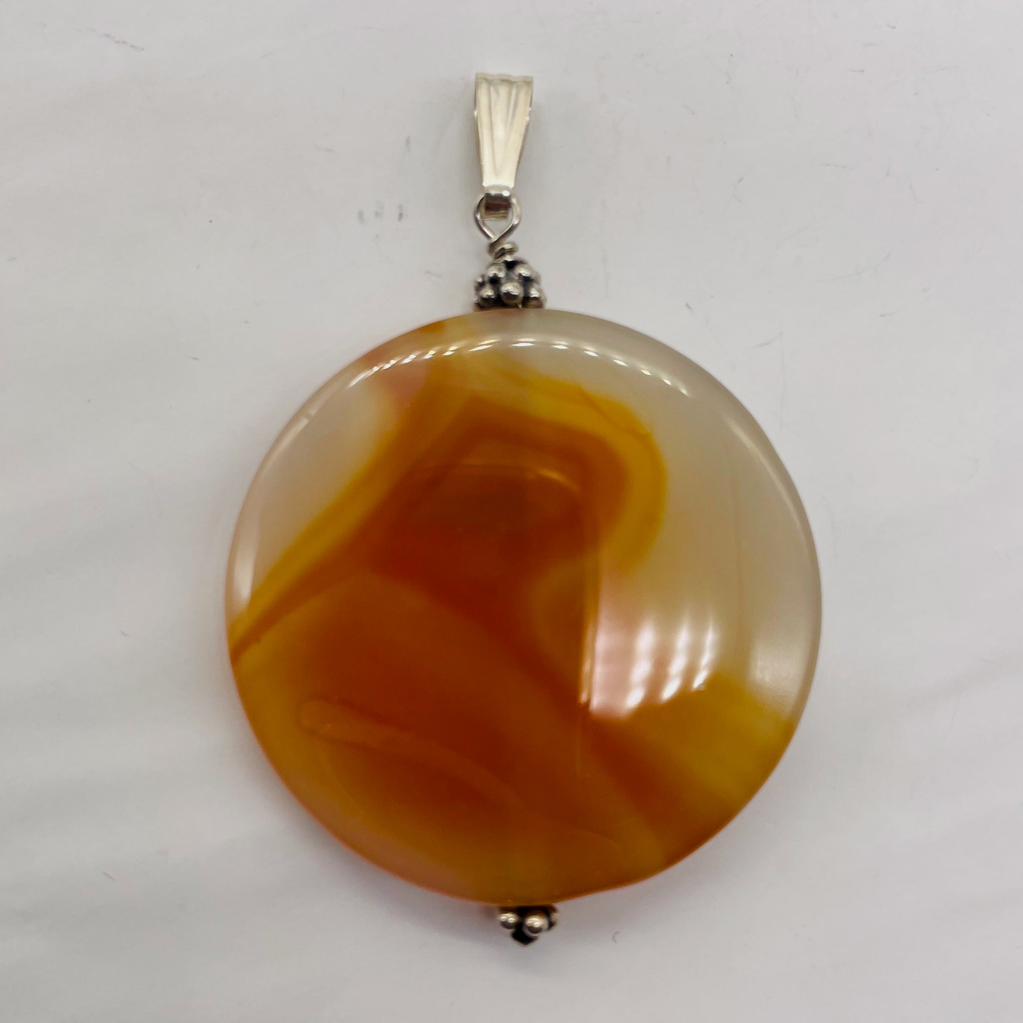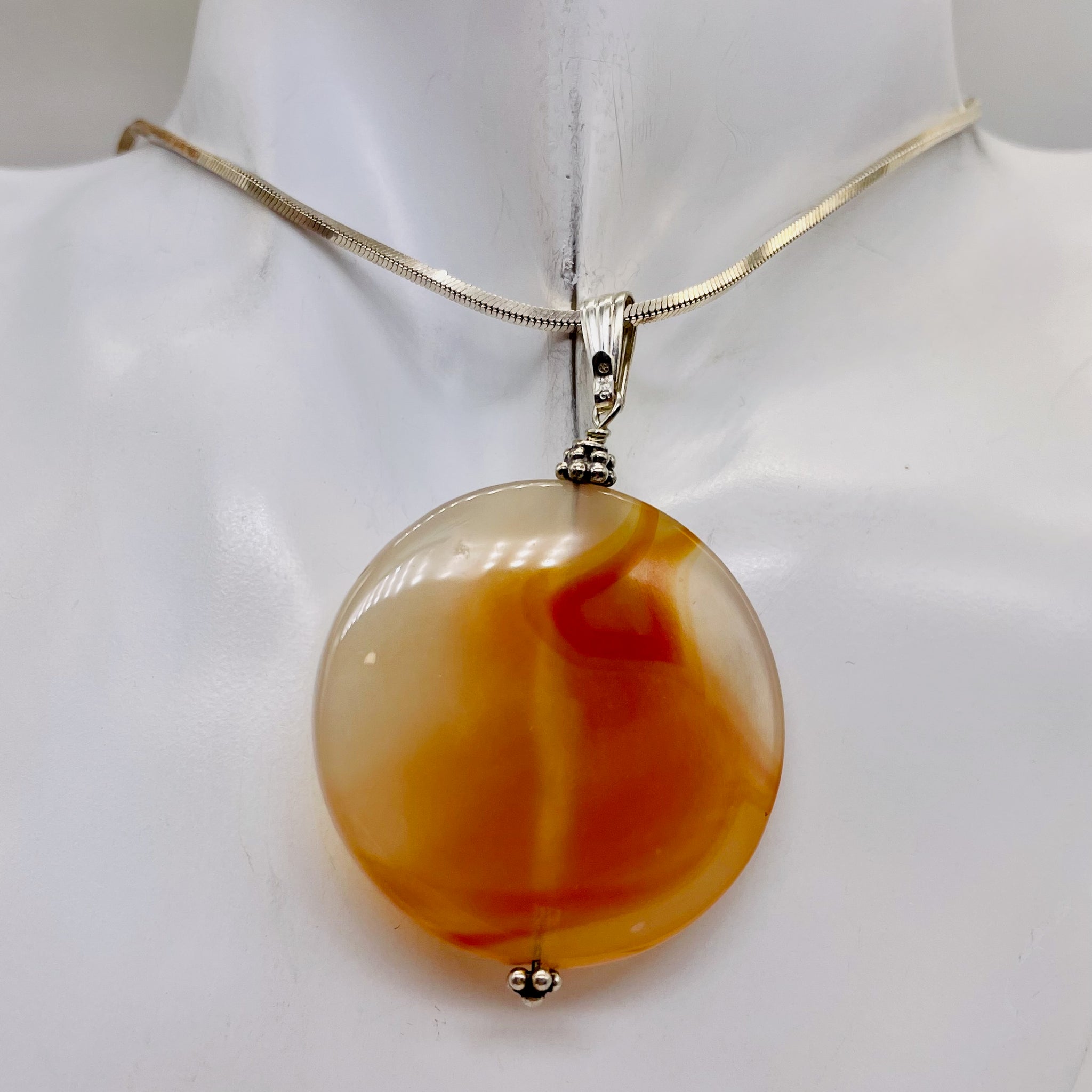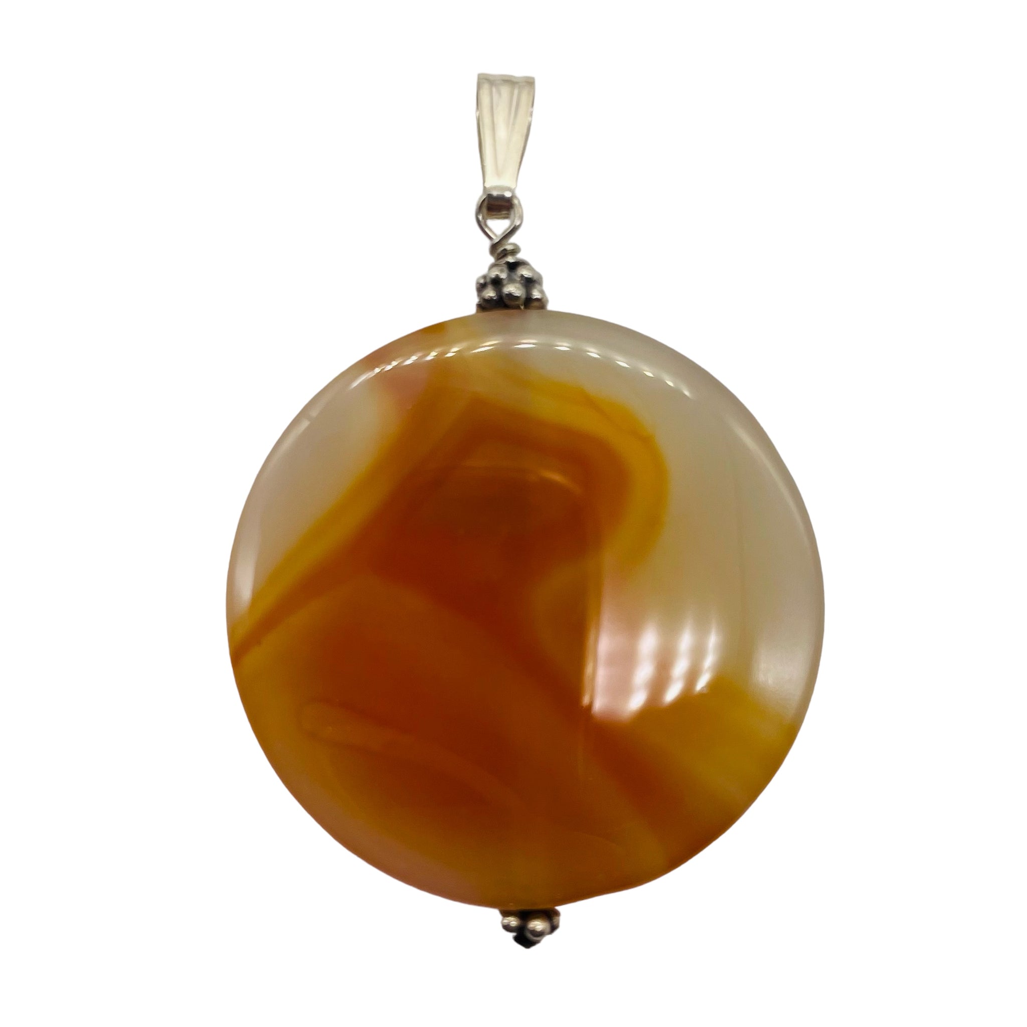 Orange White Carnelian 2" Long Round Pendant - 40mm - Symbol of Bold Energy and Joy