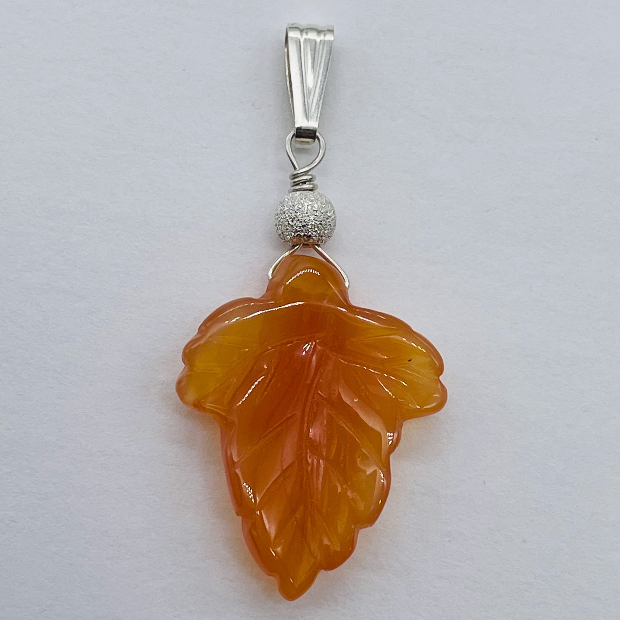 NATURAL Orange Carnelian Agate Hand Carved Leaf Sterling Silver Pendant!
