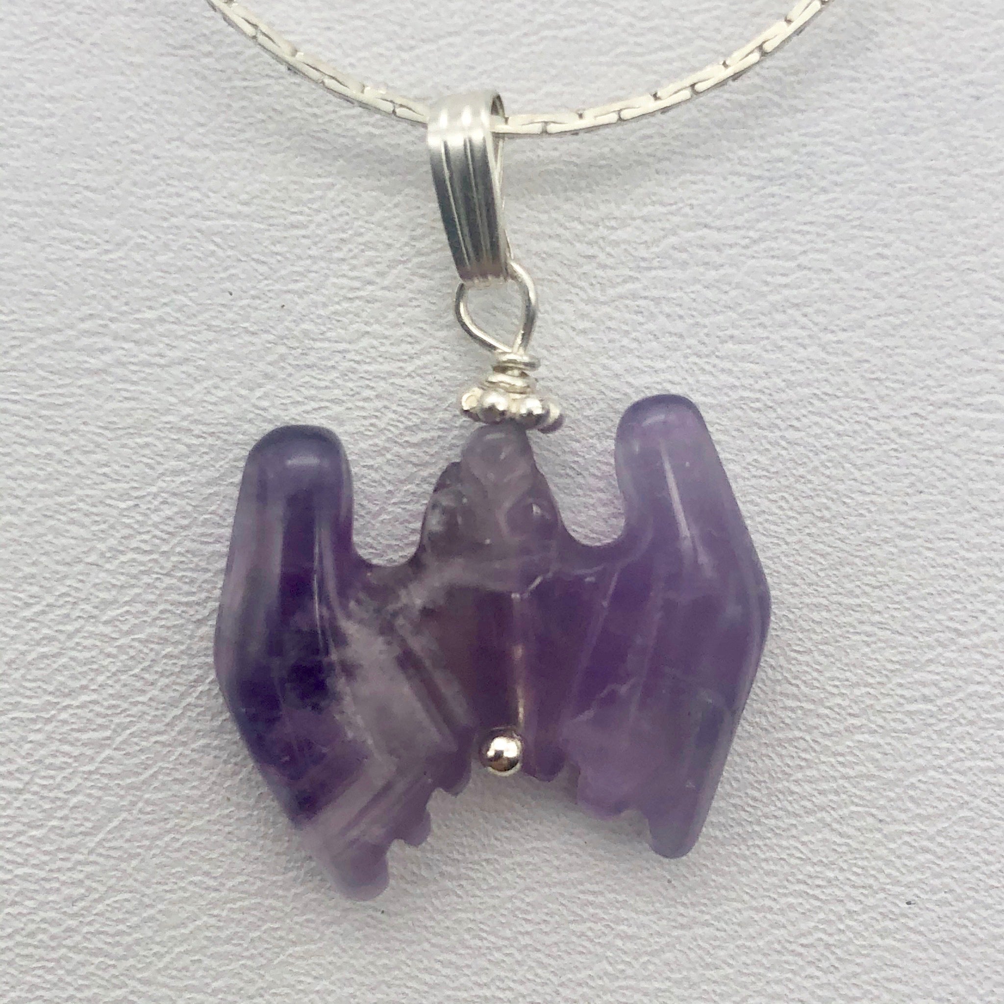 Beautiful Hand-carved AMETHYST BAT Sterling Silver Pendant!