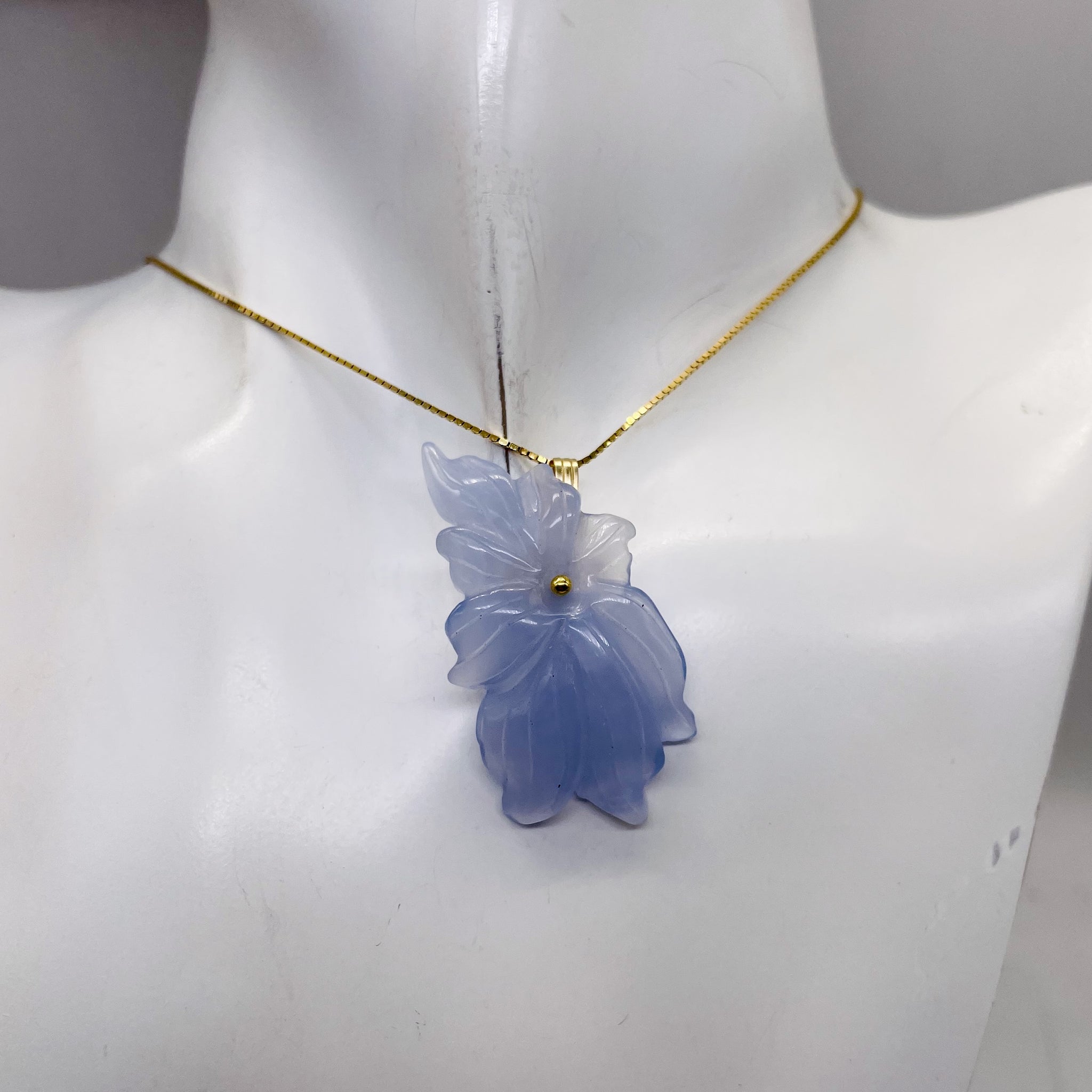 Indulge in the extraordinary rarity of this Gemmy Blue Chalcedony Flower Pendant. Hand-carved and completely natural, this blue chalcedony pendant is a true gem, adorned with 14Kgf findings. Boost your blue energy with the remarkable beauty of this pendant, which radiates a captivating periwinkle blue and angelic white, akin to the moonlight. This pendant is not just a piece of jewelry; it's a work of art.