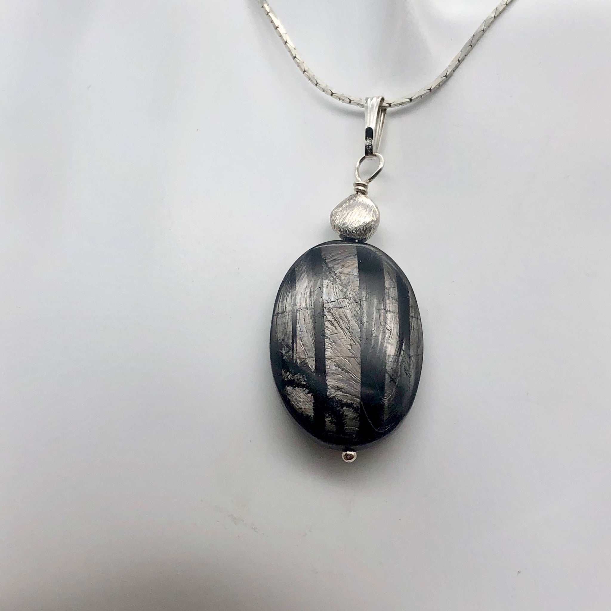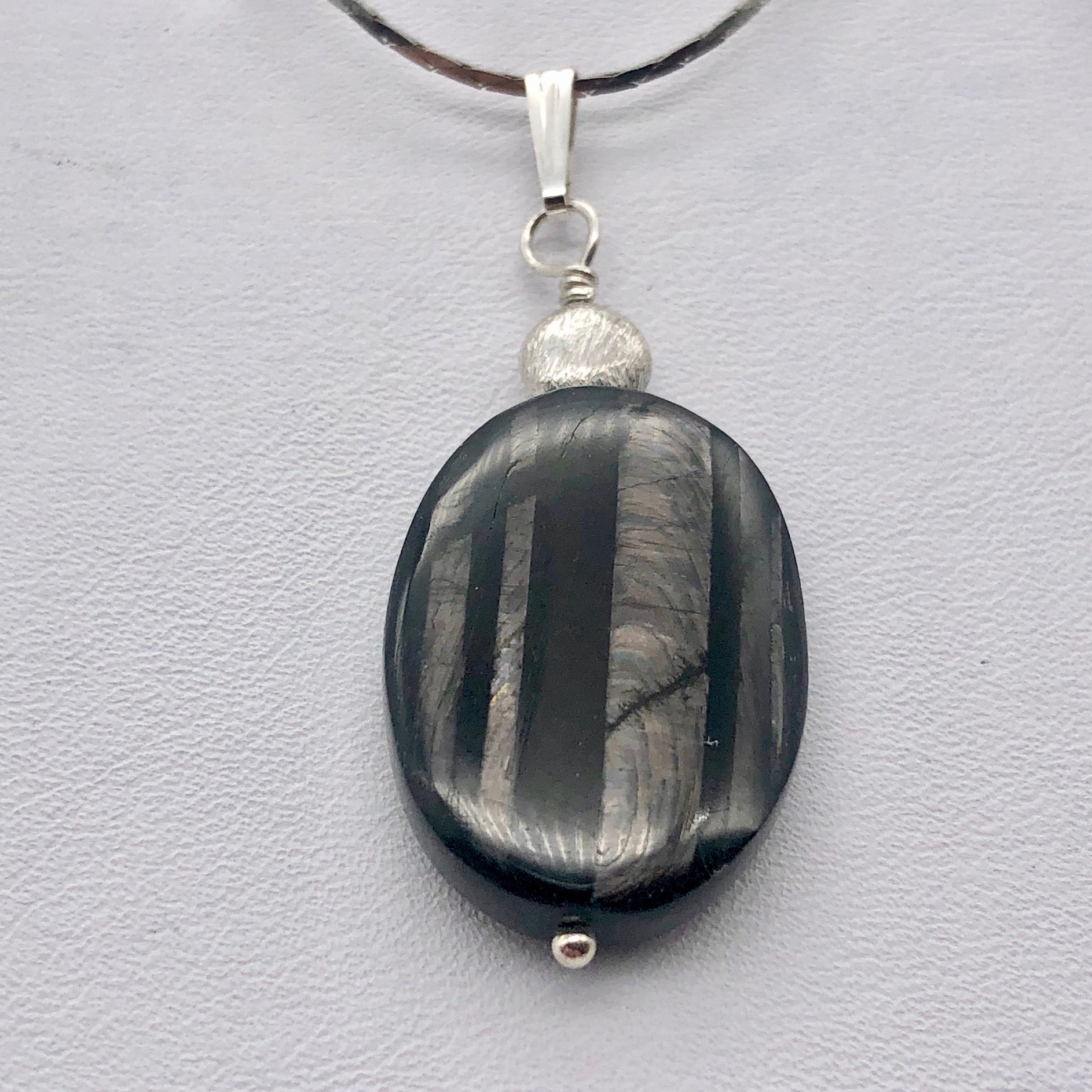 This Hypersthene pendant has incredible chatoyance!! Hypersthene beads are a black-green or black brown hue with a transparent to opaque body and can have a metallic shiller within the stone. Hypersthene is formed from Iron, Magnesium and Silicate and is mined in Brazil, Spain, Sri Lanka, Australia, Canada, Russia.