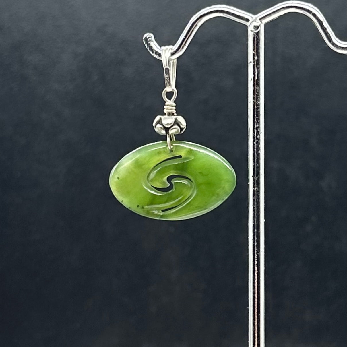 This exquisite pendant is carved from natural Nephrite Jade and set with a sterling silver finding. The design represents the Koru, a symbol deeply rooted in Māori tradition. The koru, inspired by the shape of an unfurling fern frond, symbolizes new life, growth, regeneration, and peace. Its circular form reflects perpetual movement, while the inward coil suggests a return to the point of origin-an emblem of harmony and continuity.