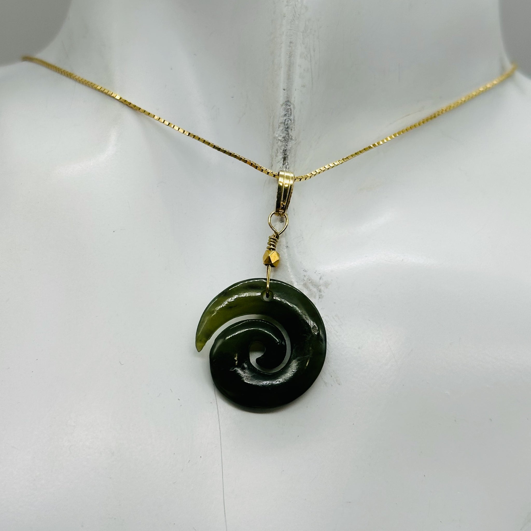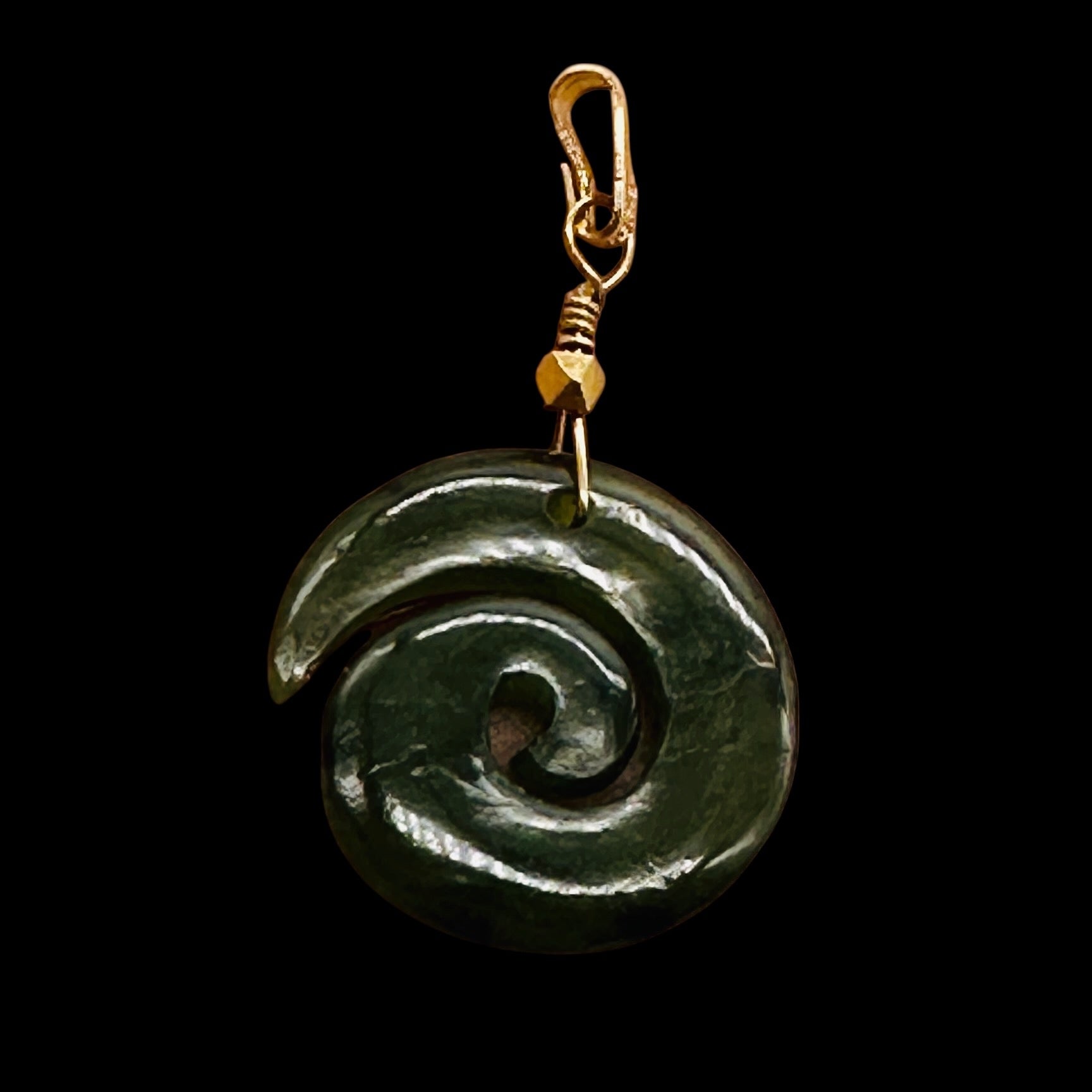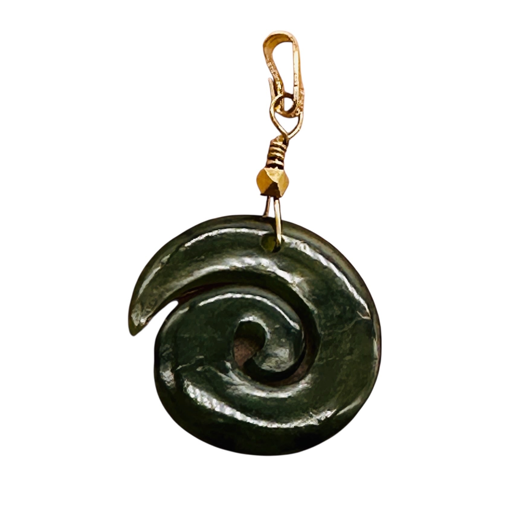 This exquisite pendant is carved from natural Nephrite Jade and set with a sterling silver finding. The design represents the Koru, a symbol deeply rooted in Māori tradition. The koru, inspired by the shape of an unfurling fern frond, symbolizes new life, growth, regeneration, and peace. Its circular form reflects perpetual movement, while the inward coil suggests a return to the point of origin-an emblem of harmony and continuity.