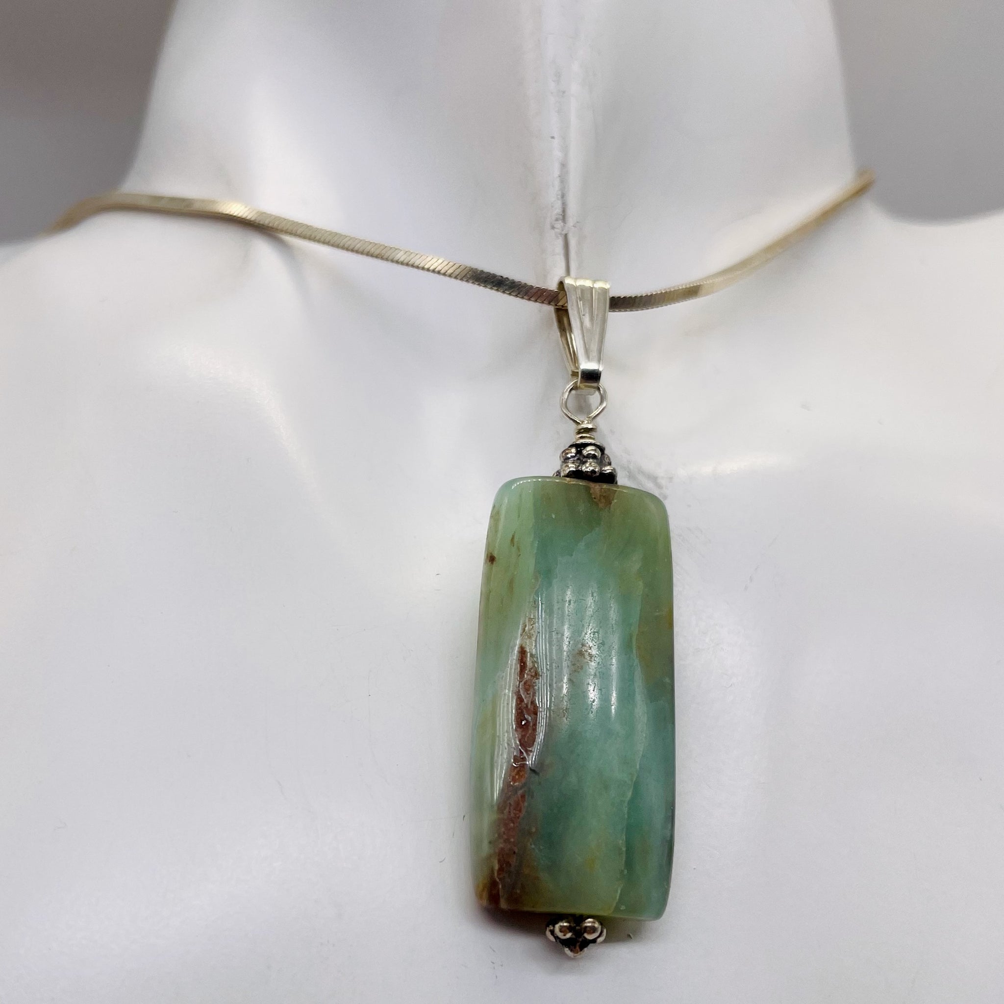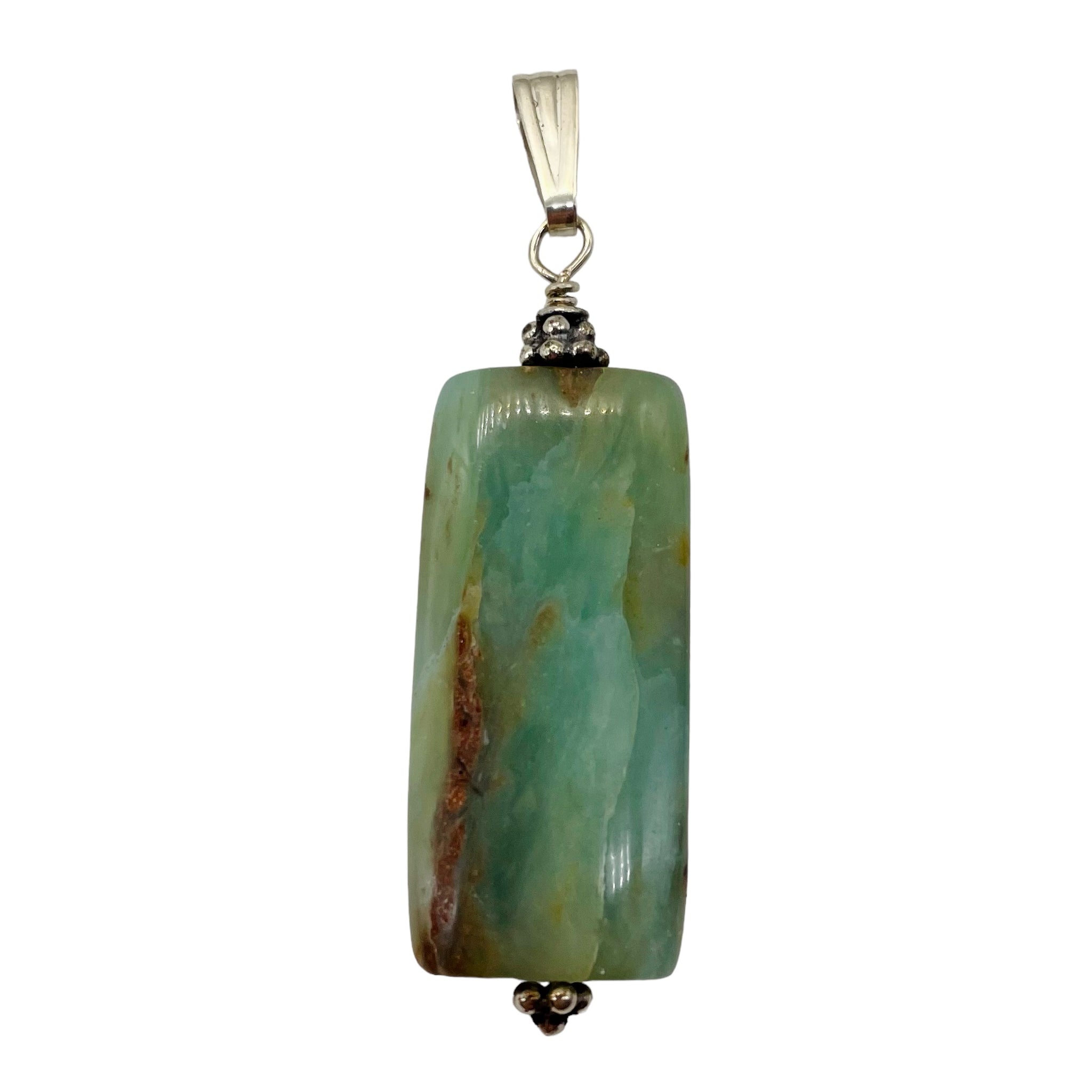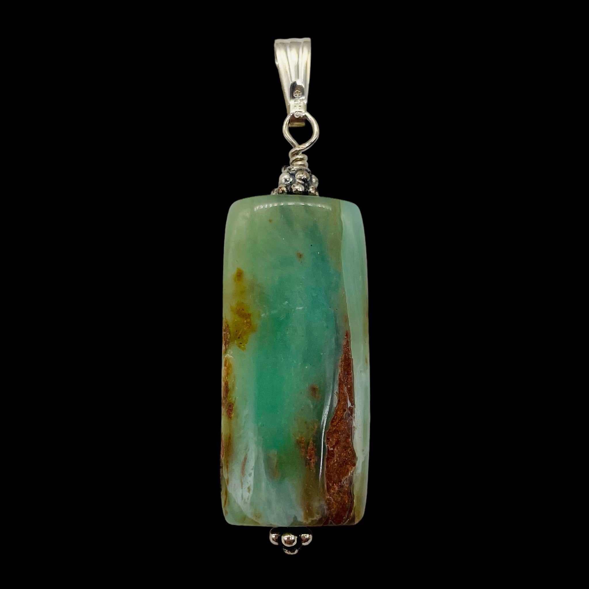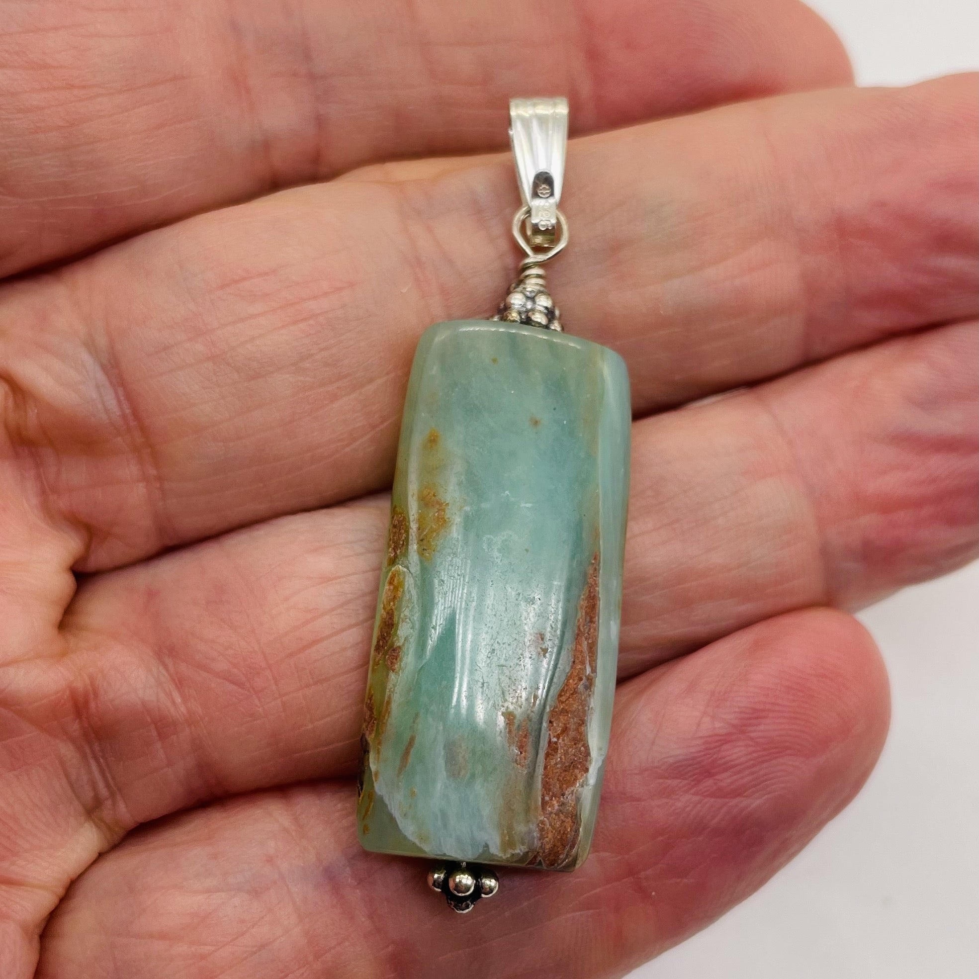 Embrace tranquility with our Peruvian Opal Sterling Silver Rectangle Cut Pendant. This 2" long pendant, adorned with the calming hues of Green and Pink, is not just a piece of jewelry but a powerful healing stone associated with the heart chakra. Peruvian opal is believed to reduce stress, promote good fortune in relationships, and enhance feelings of groundedness and emotional connection.