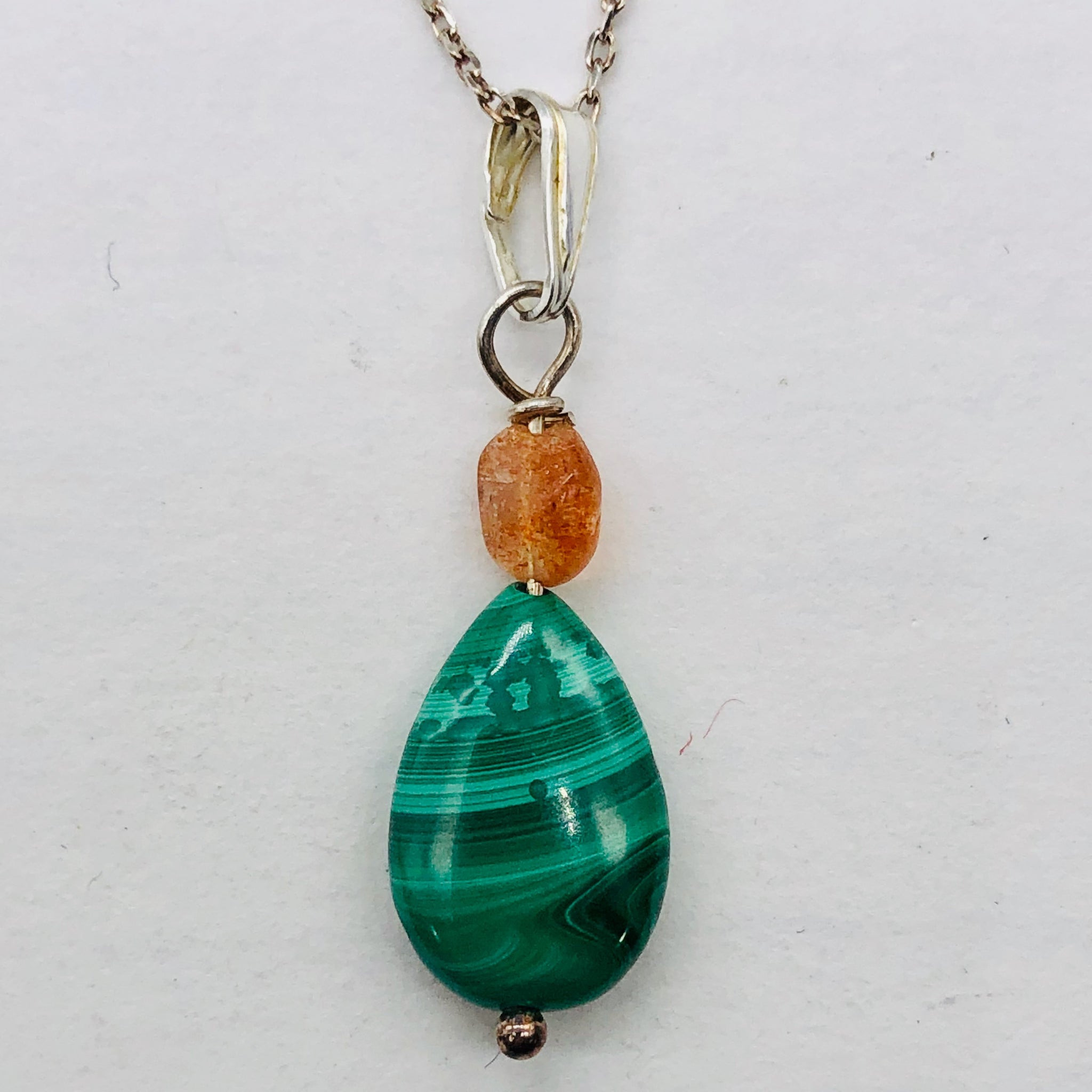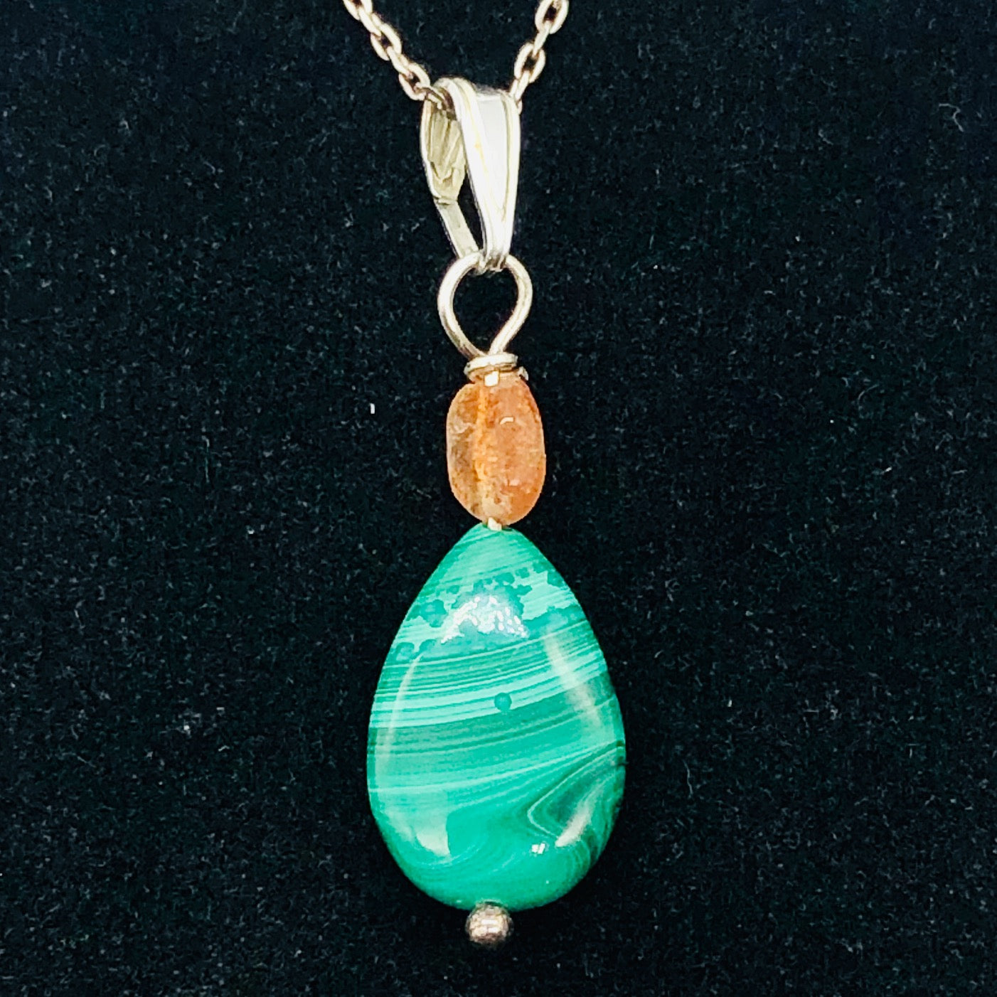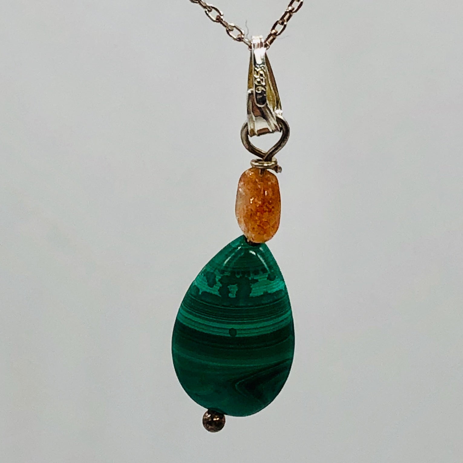 Green/Pink Pink Topaz and Malachite Sterling Silver Drop Pendant.