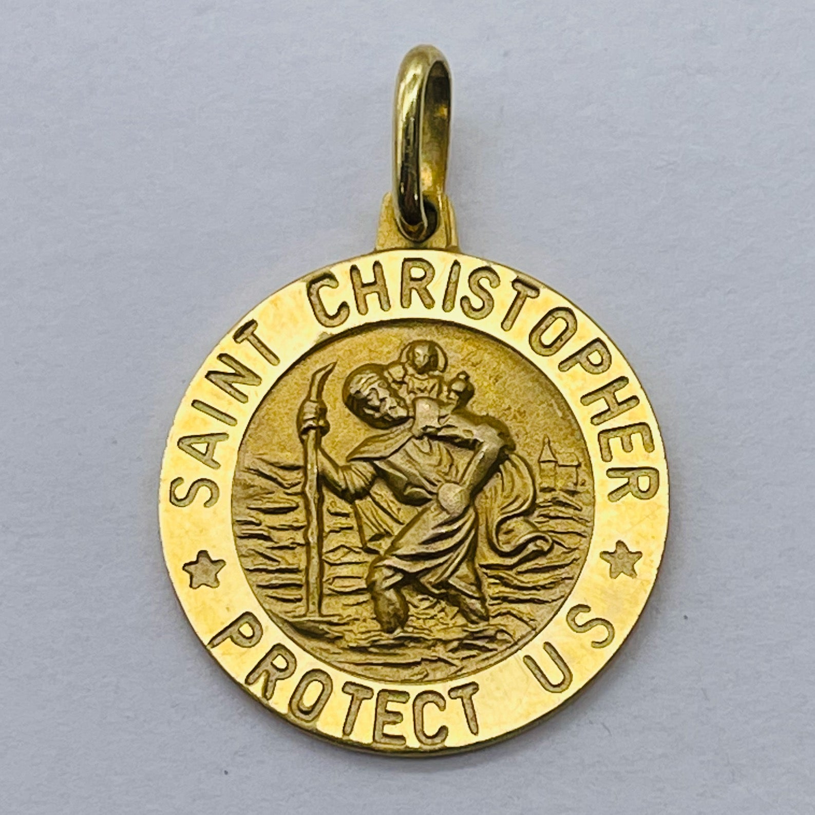 Saint Christopher is the patron saint of travellers, including motorists, who sometimes hang a small image of him in their vehicle for luck. According to legend, he was crossing a river when a child asked to be carried across.Inspired by St. Christopher's ability to protect the child on his back from the dangerous waves of the river that they crossed, these medallions have come to represent protection, particularly over travelers.