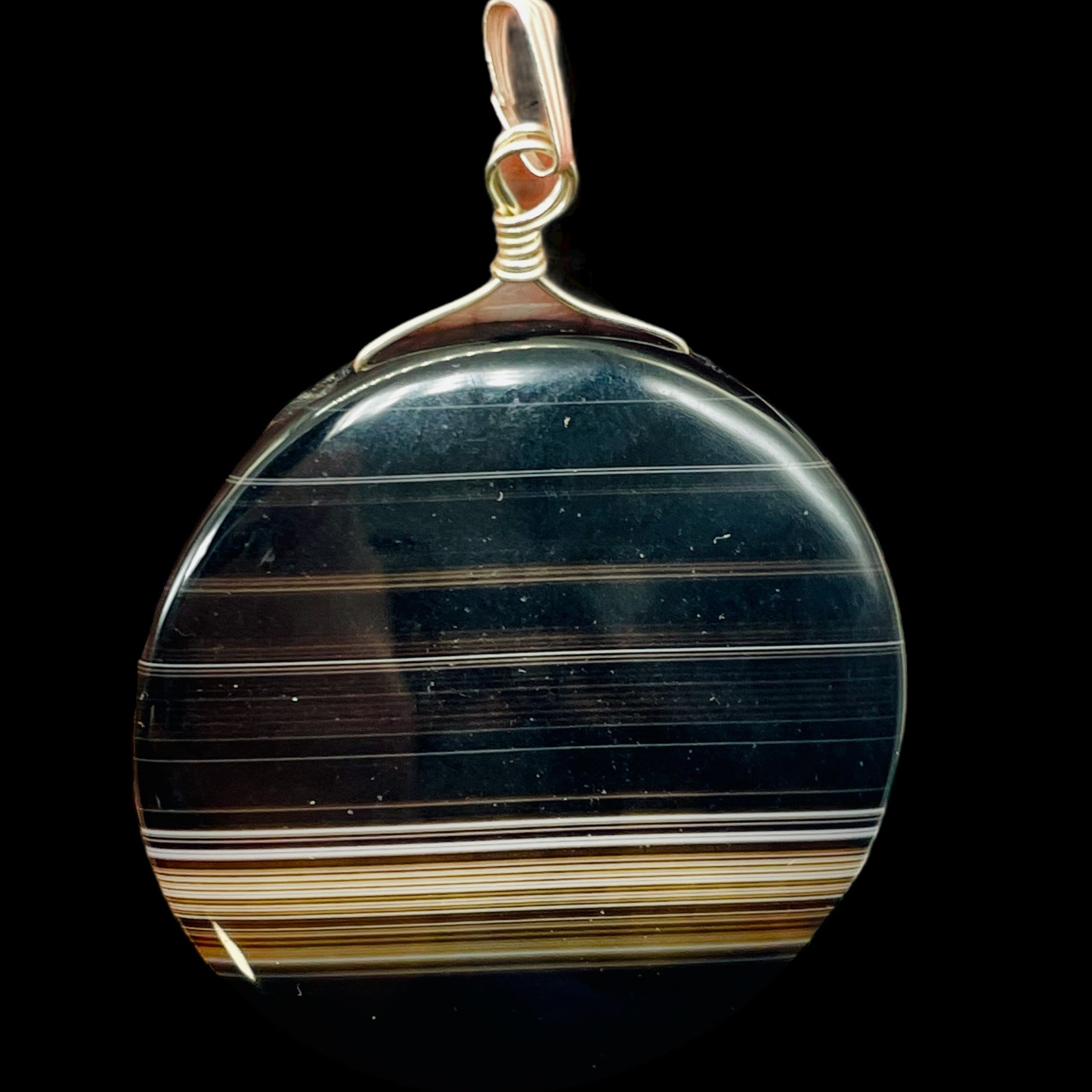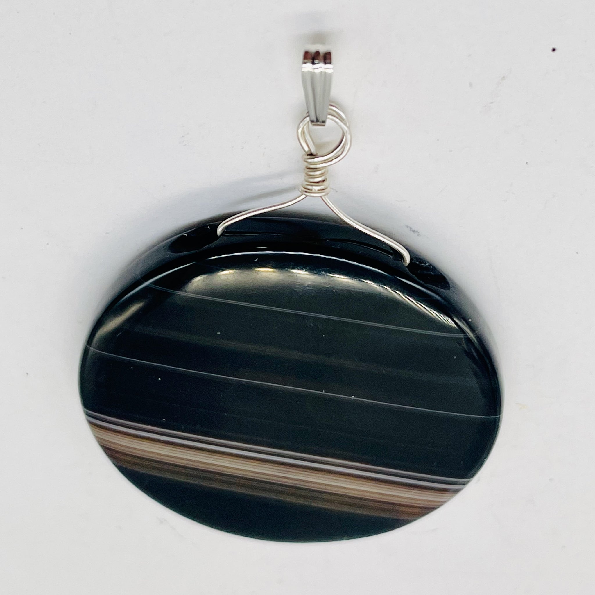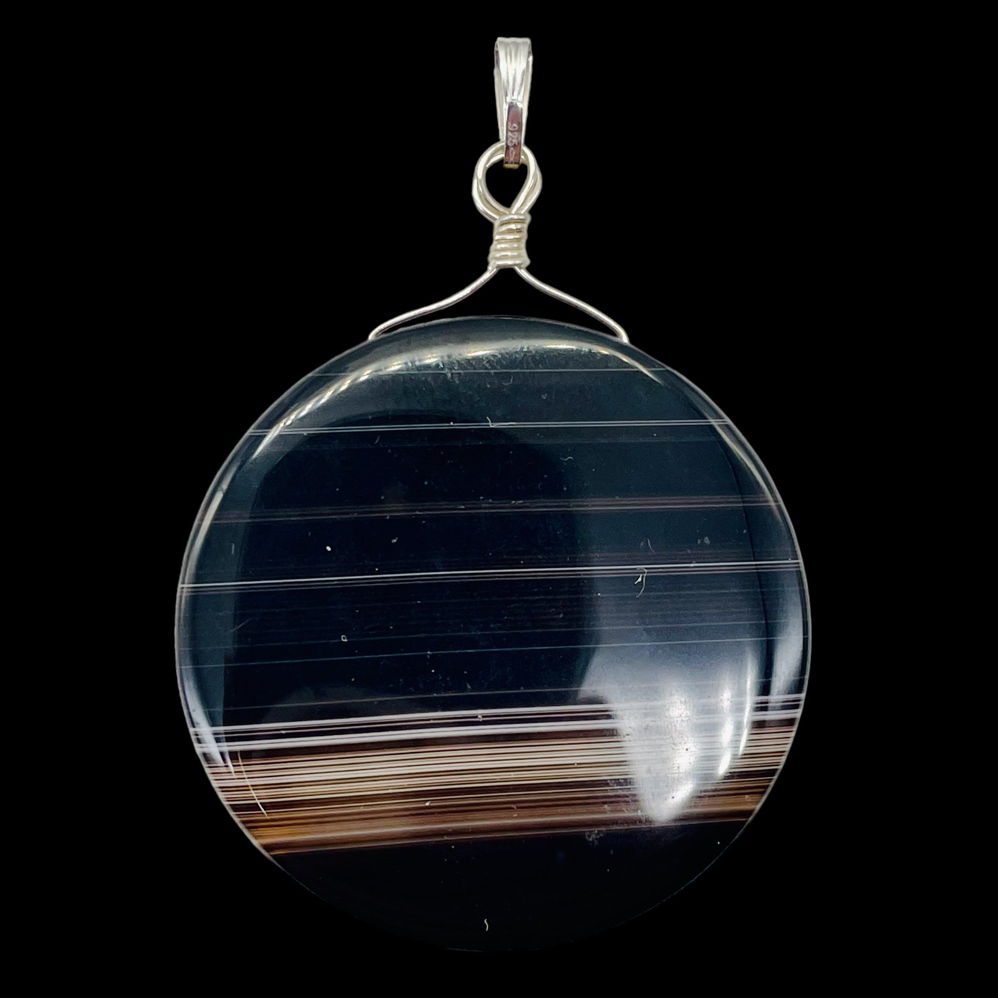 Prepare to be astonished by the beauty of this Sardonyx Coin Bead Sterling Silver Pendant. Crafted from a type of chalcedony agate, this bead possesses an internal glow and captivating intensity. Its patterns of milky white against a backdrop of black skies create a mesmerizing effect, with some parts even being translucent. This pendant is not just a jewelry piece; it's a masterpiece waiting to happen. Sardonyx is believed to enhance courage and eloquence, making this pendant even more extraordinary.