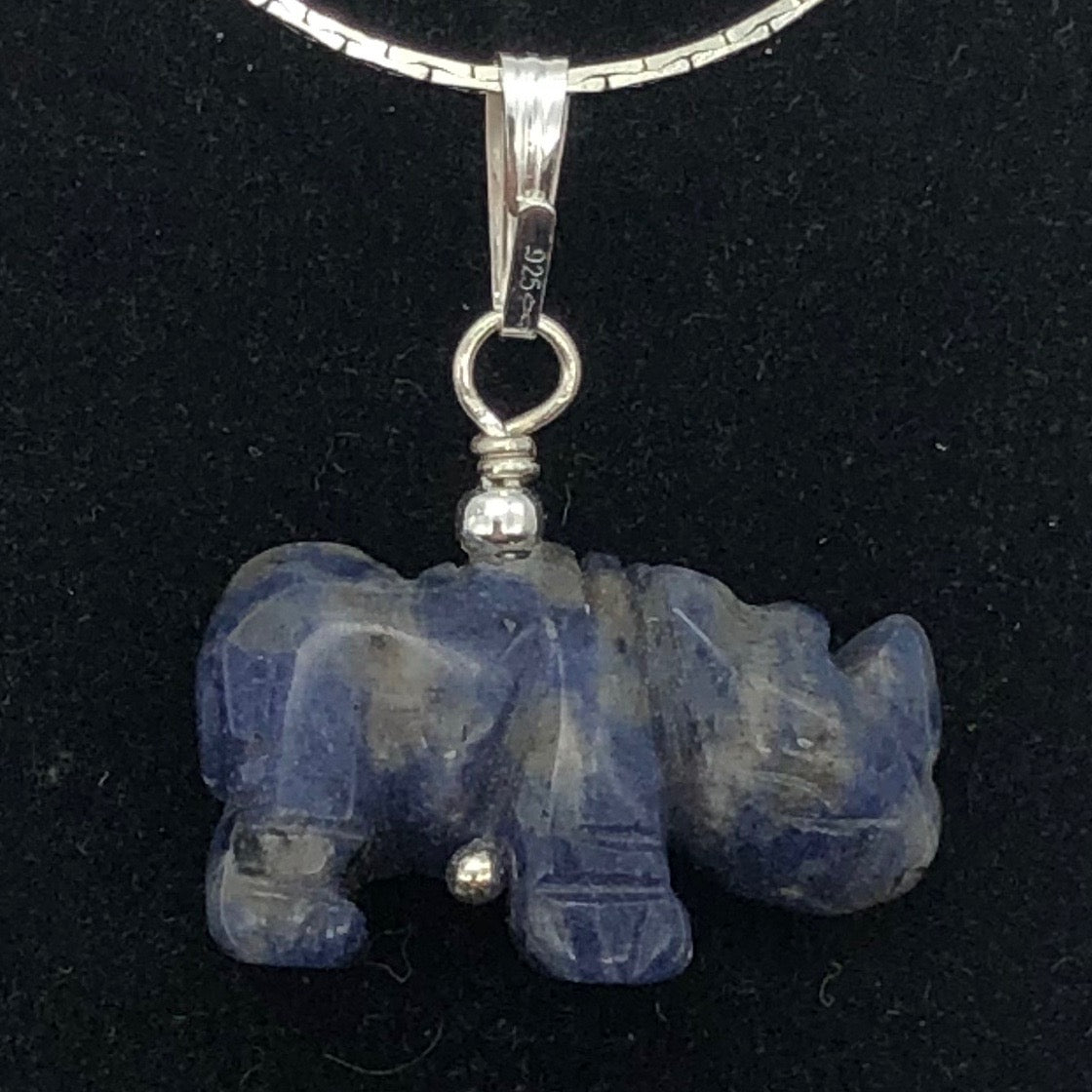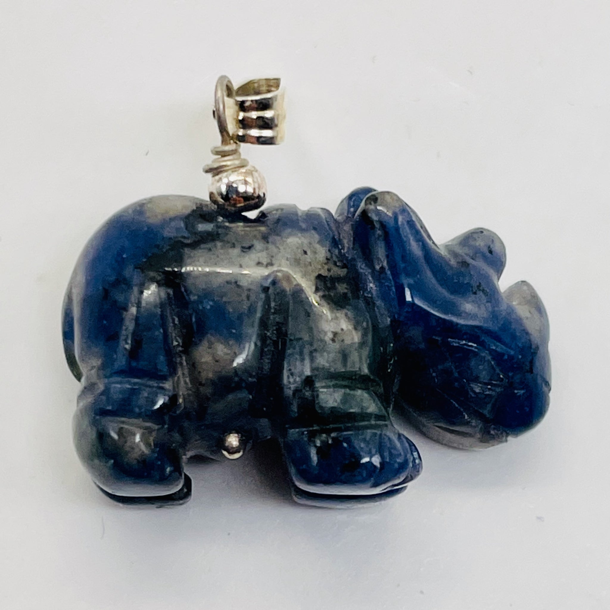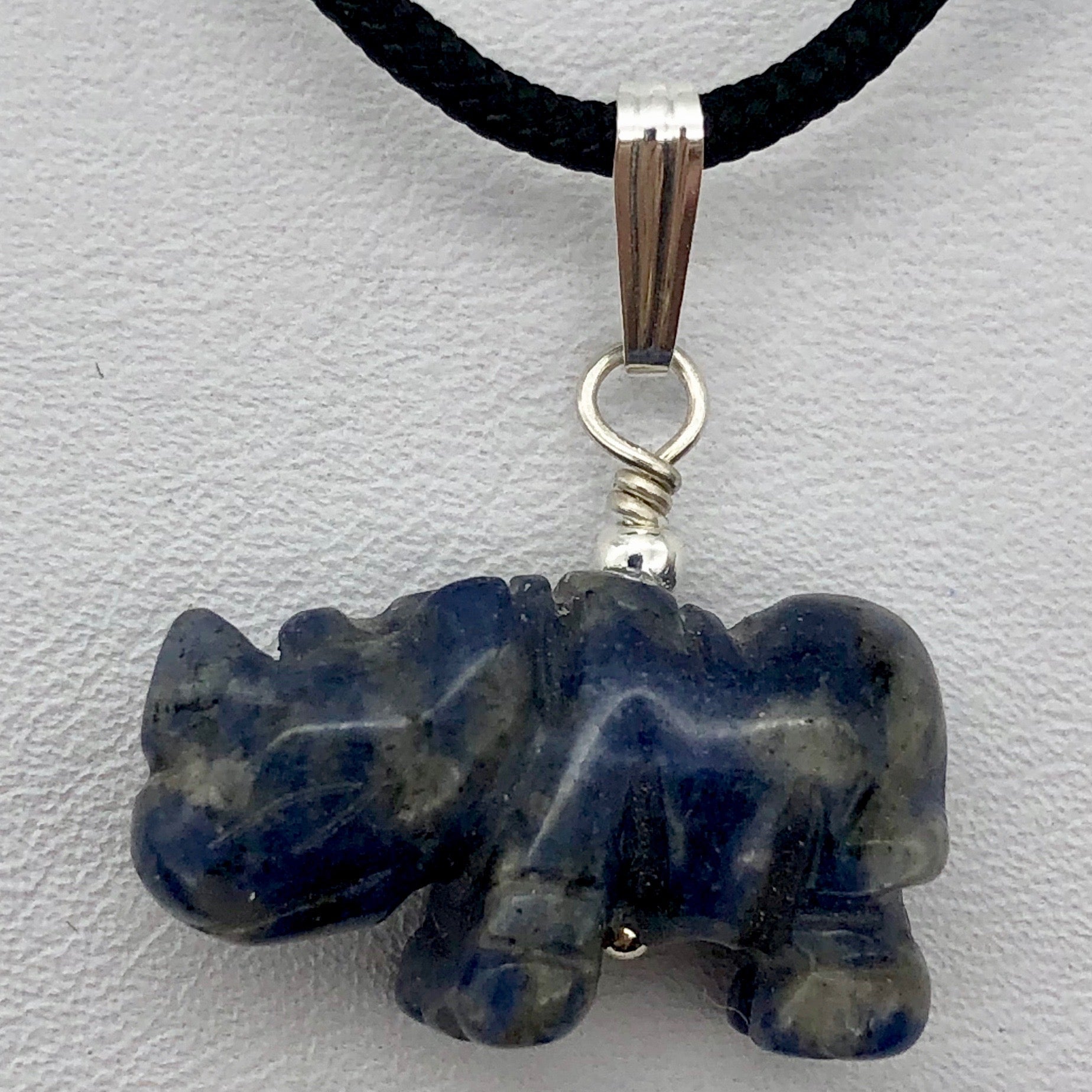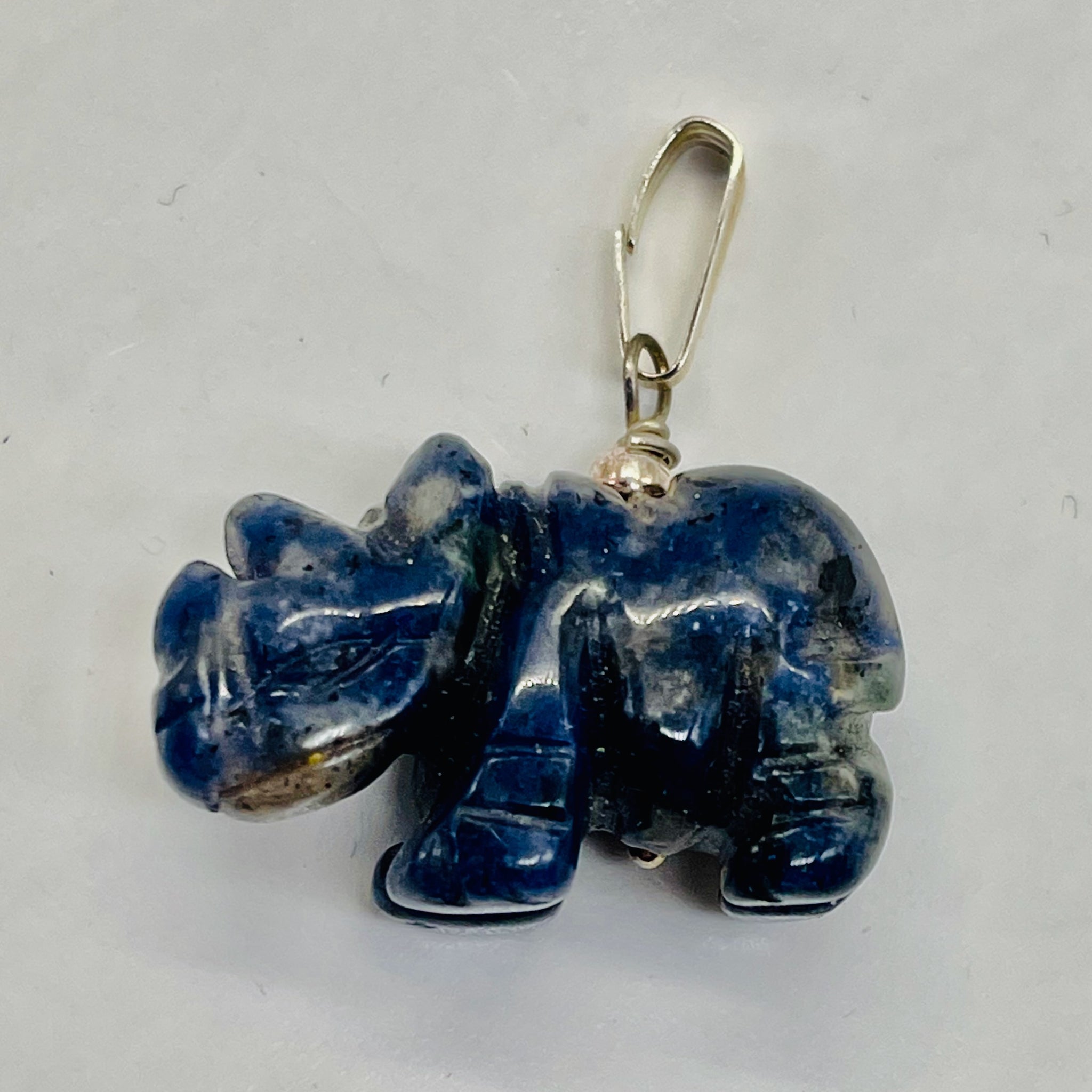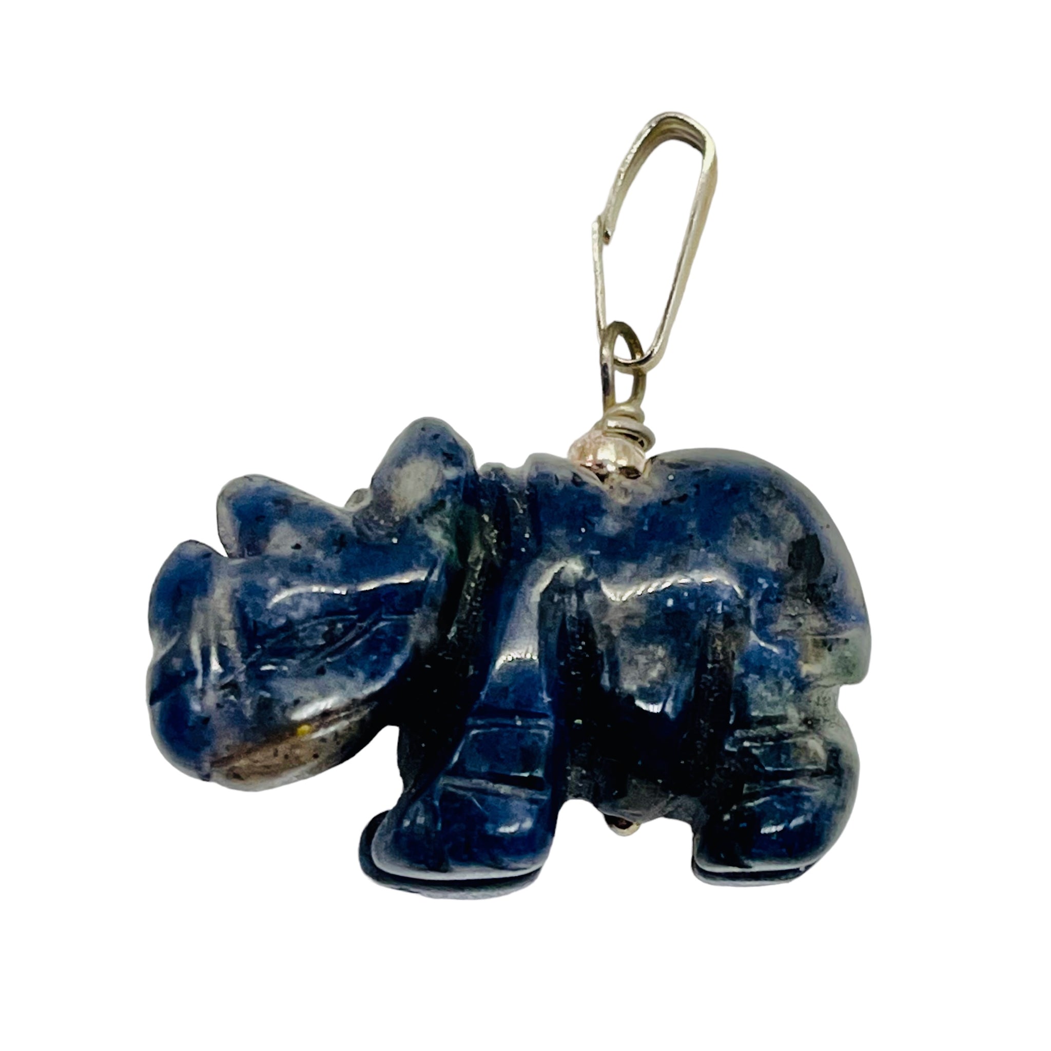 This is for one Hand carved SODALITE Rhinoceros Sterling Silver pendant. SODALITE is a stone that is a navy blue base with white clouds of albite throughout!