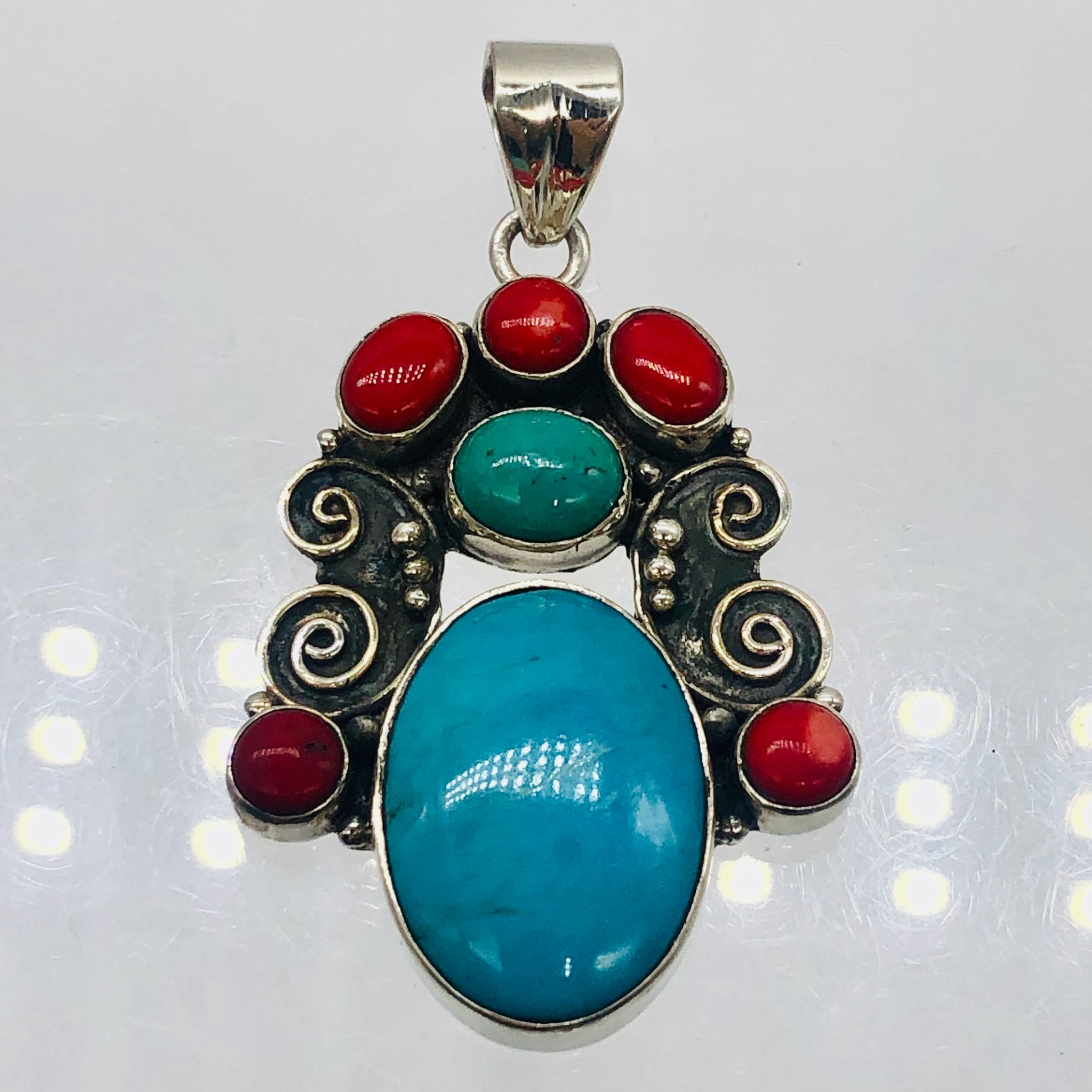 Material Type: Turquoise Coral Native American Sterling Silver Pendant