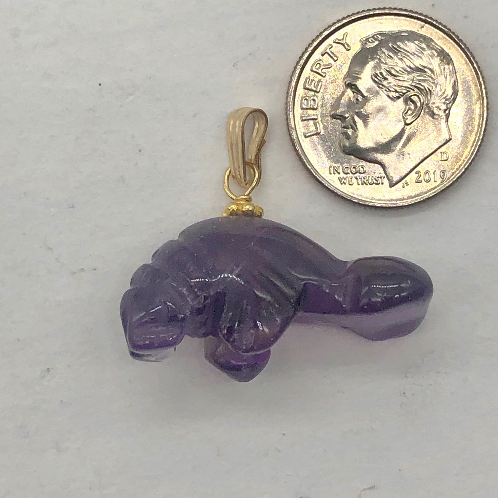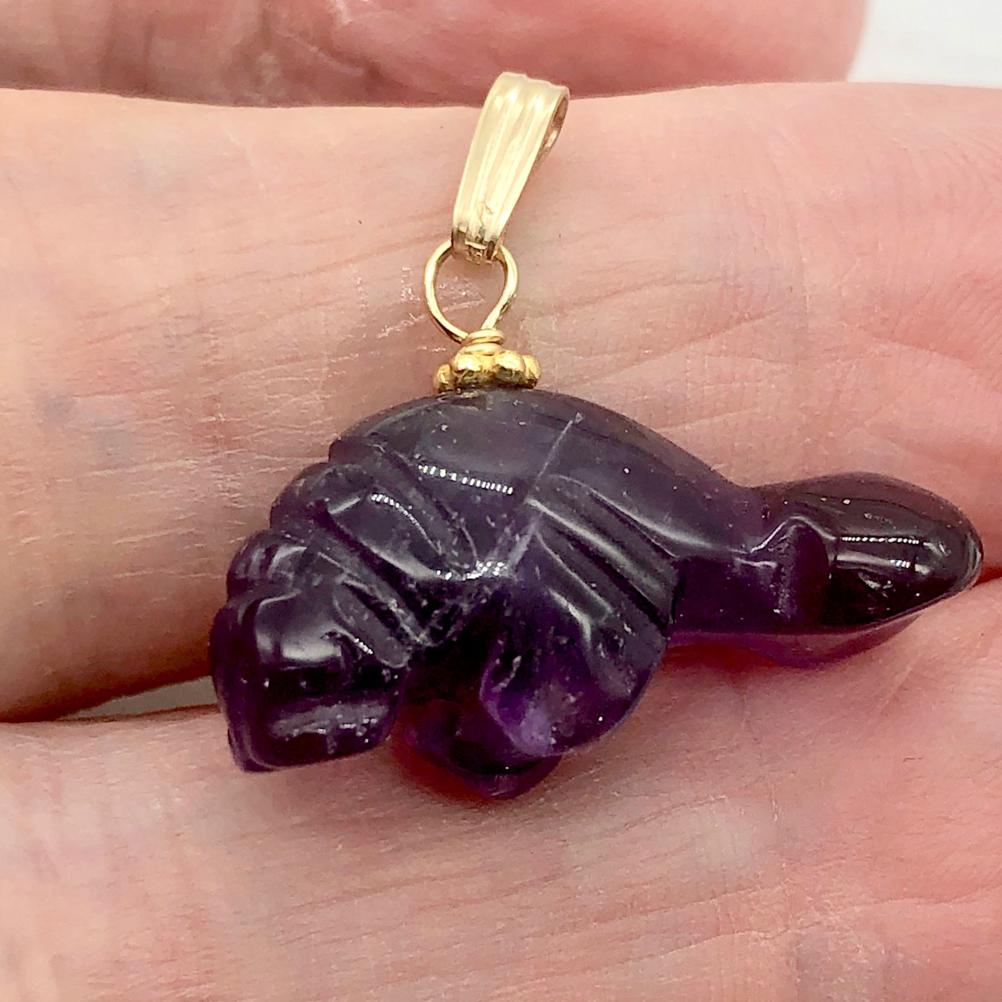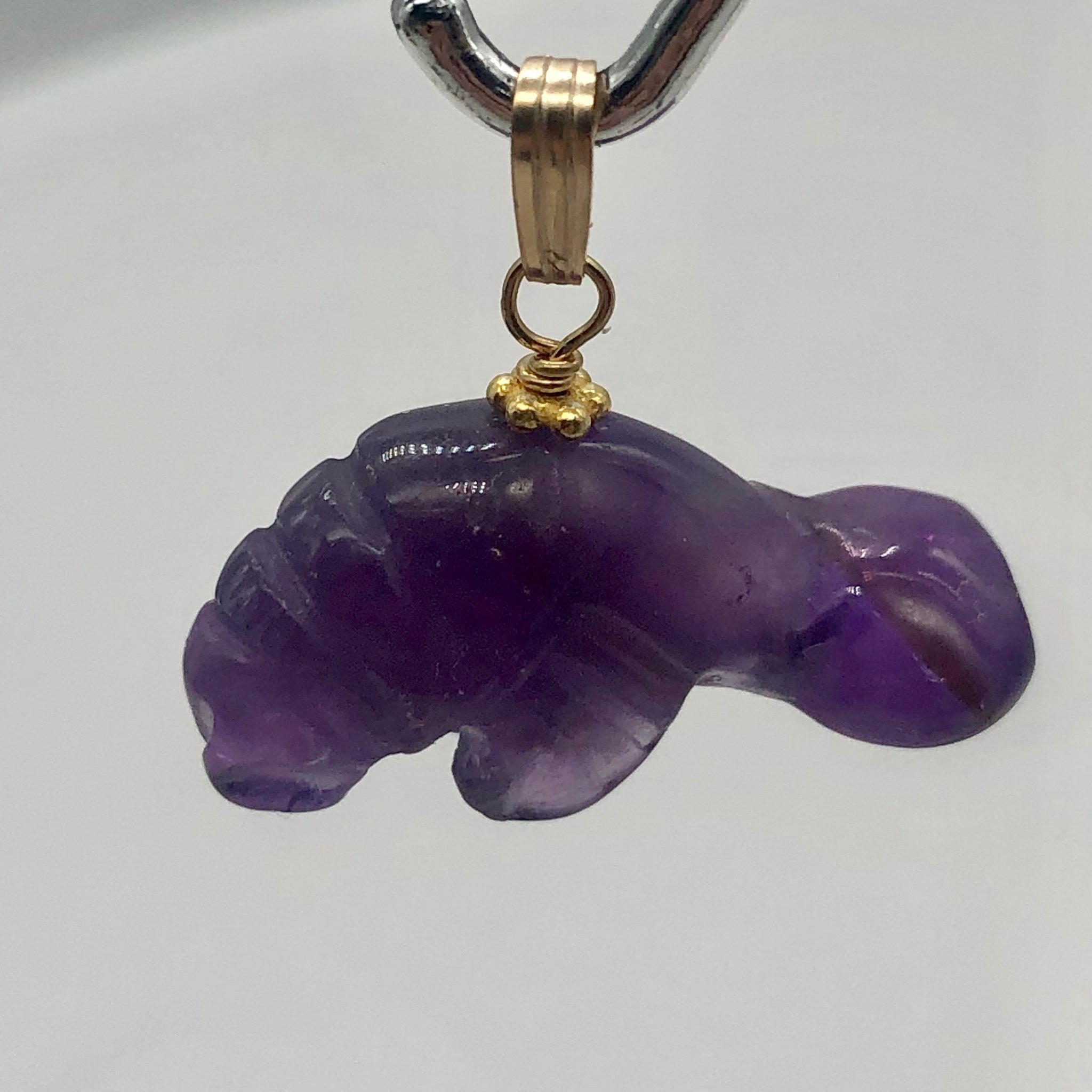 This is for a hand carved Amethyst Manatee Bead 14K Gold Filled Pendant. The hand carving is exquisitely executed. This bead pendant of lovely Amethyst will add beauty and uniqueness to any outfit. Don't miss out on this charming pendants!!