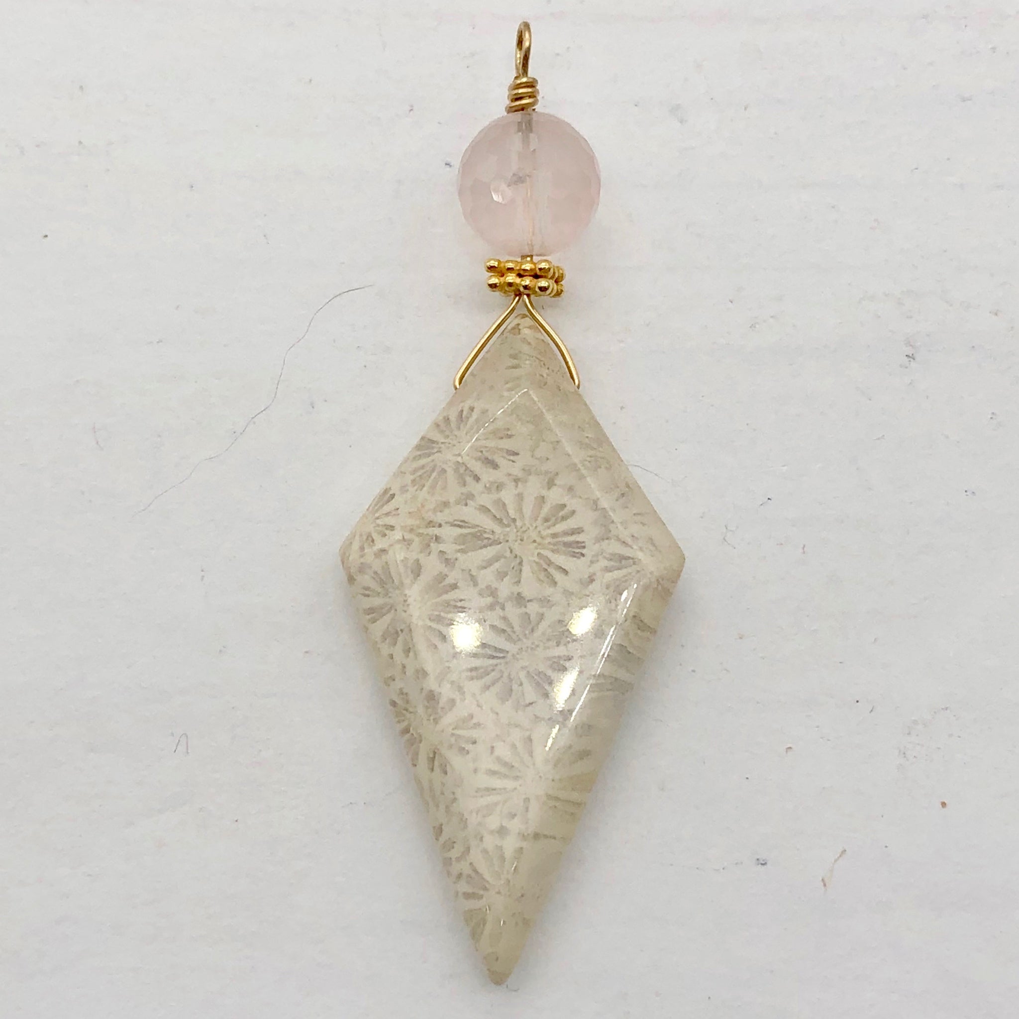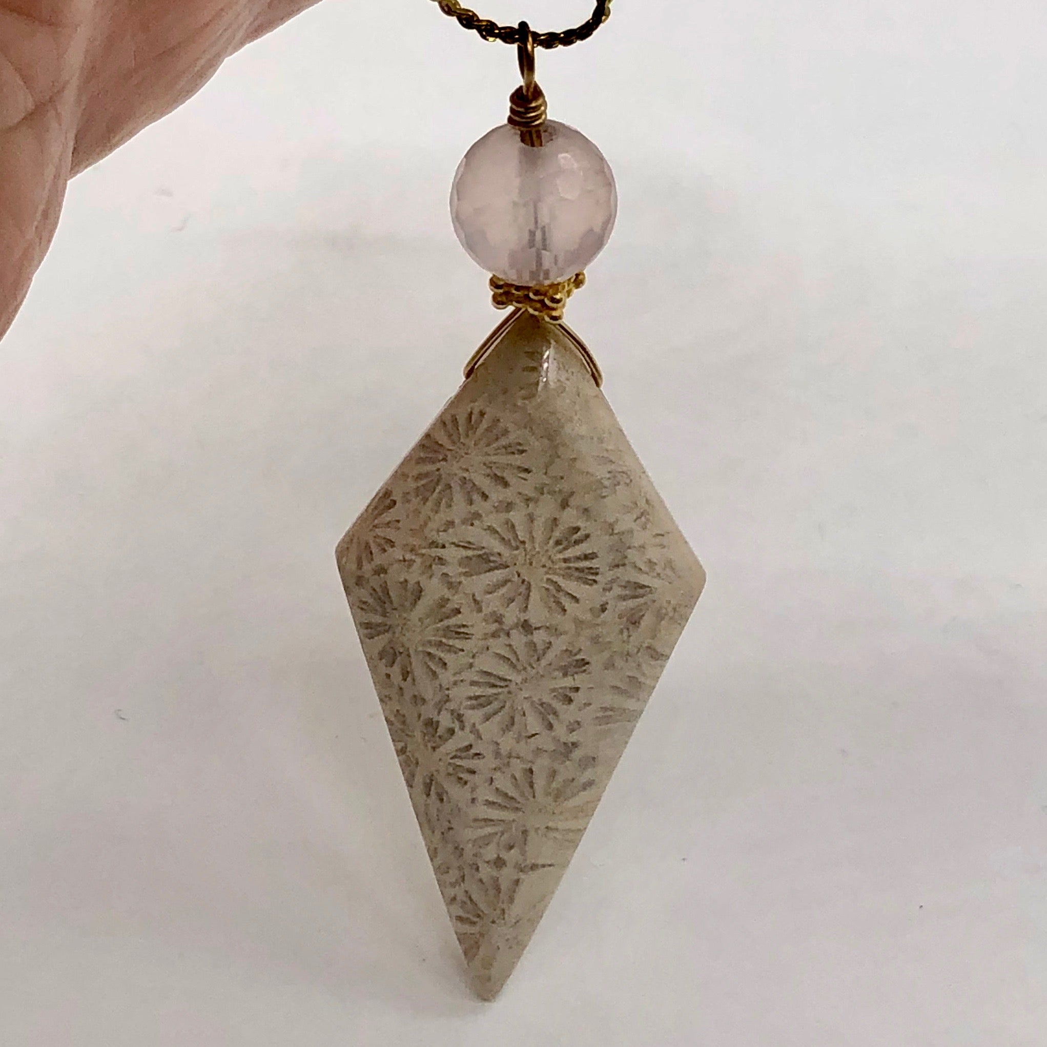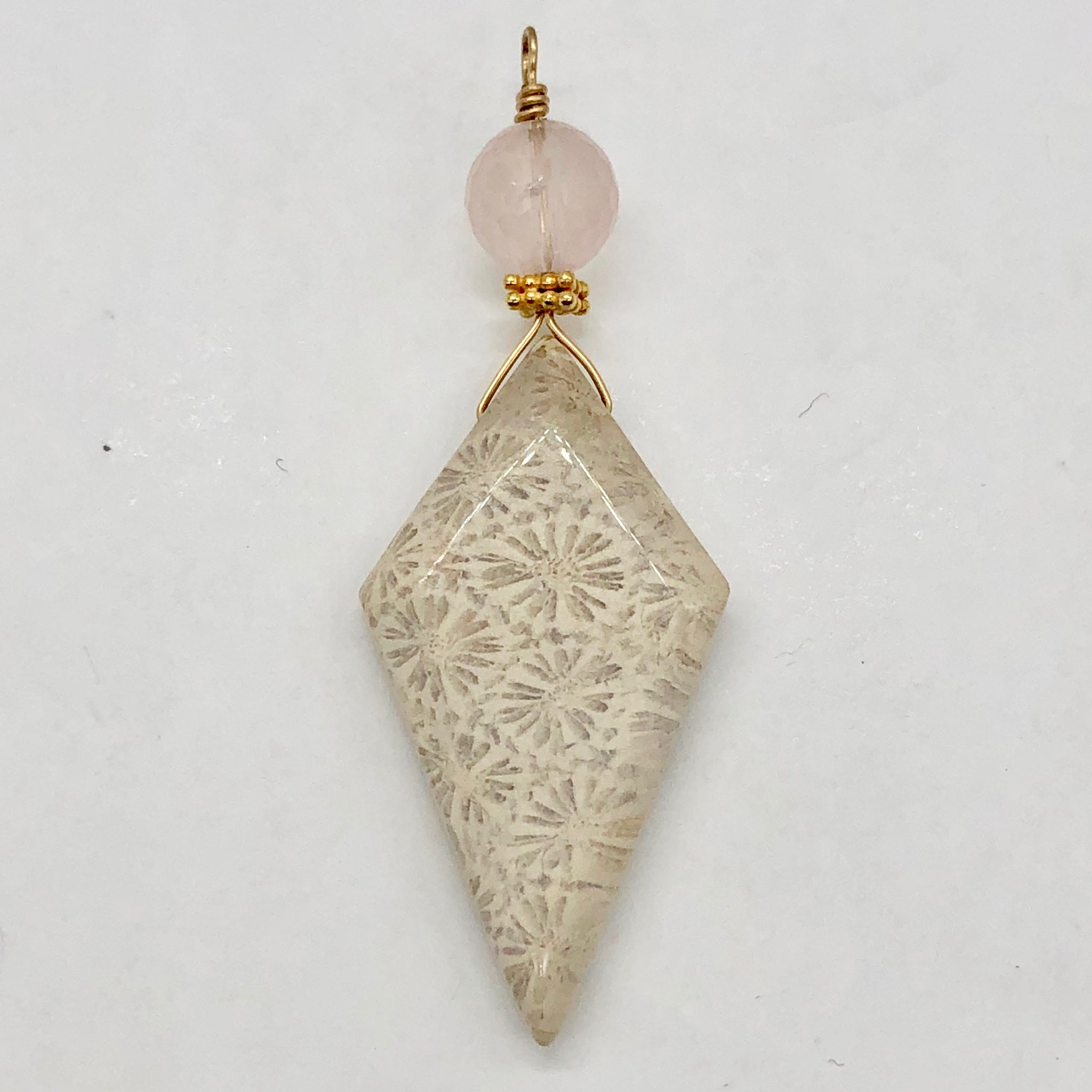 This is for one amazing FOSSILIZED CORAL Pendant with a Pink Kunzite accent Bead. Each bead is cut to reveal the incredible natural beauty of this treasure of creation. The colors are a wide array of the natural intense earthy tones from wonderful warm taupe, to soothing sand, and many more. The cutting and drilling of these beads is done with precision and expertise. The polish is superb with a high glossy finish. Fossilized coral is also known as agatized coral and Petoskey stone!