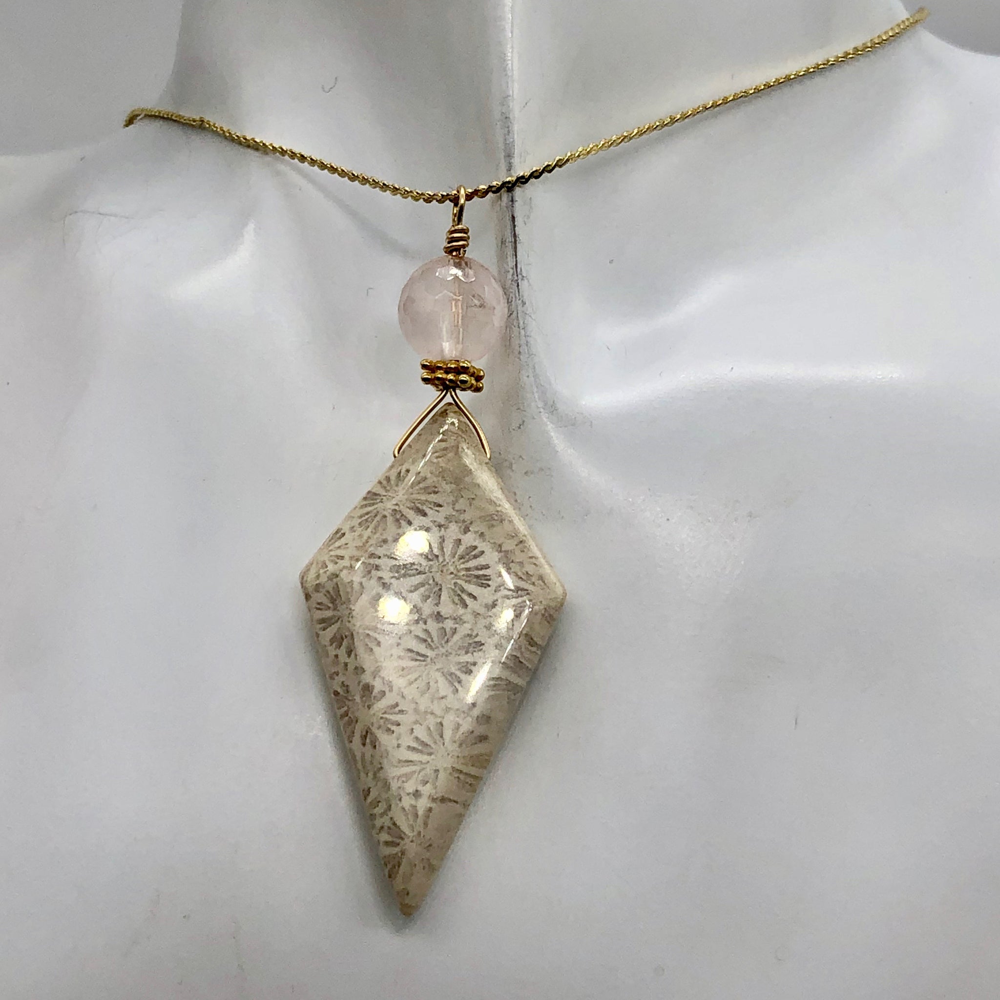 White, Black Fossilized Coral Kite Kunzite Bead 14K Gold Filled Pendant.